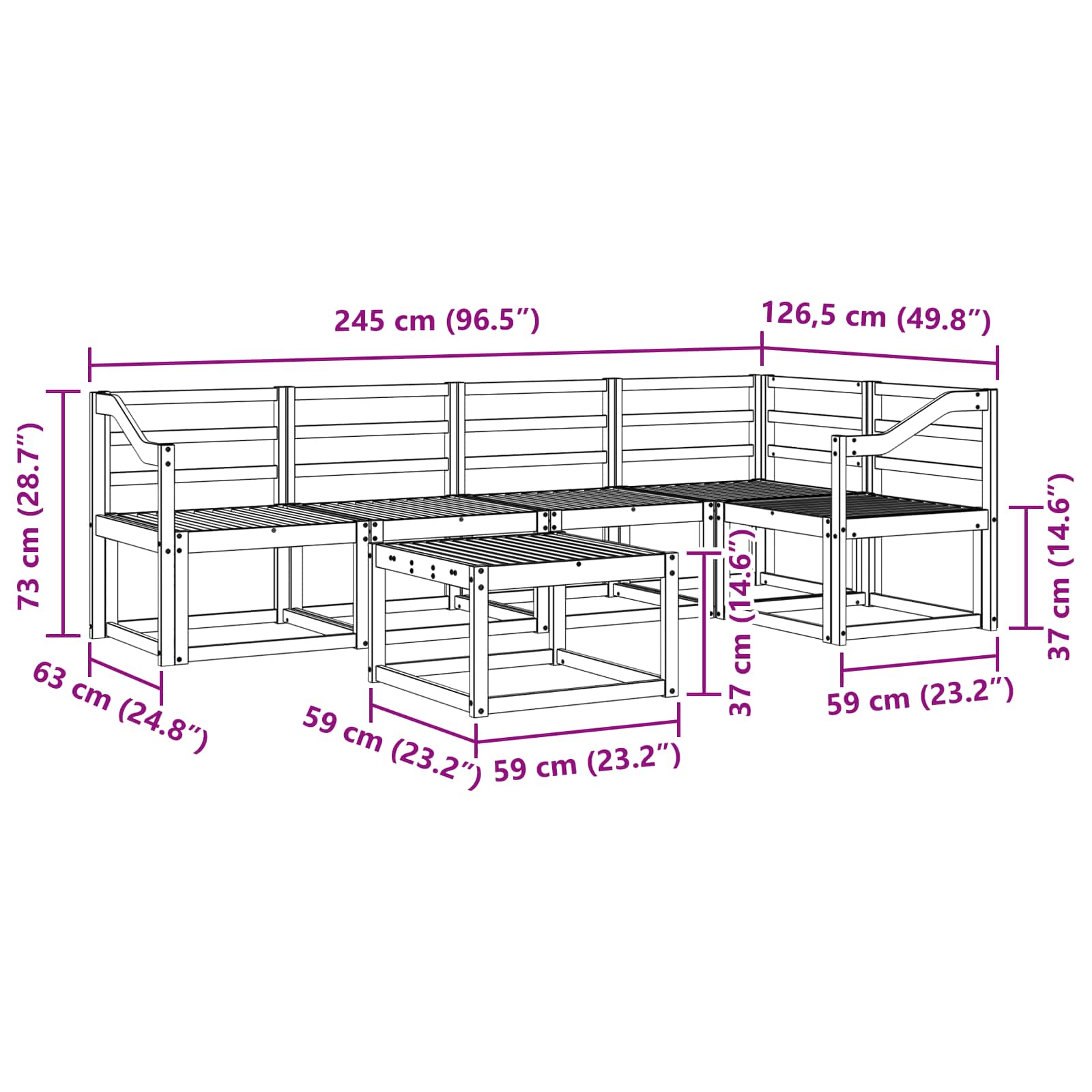 • 4 x Keskisohva: 59 x 63 x 73 cm (P x L x K)