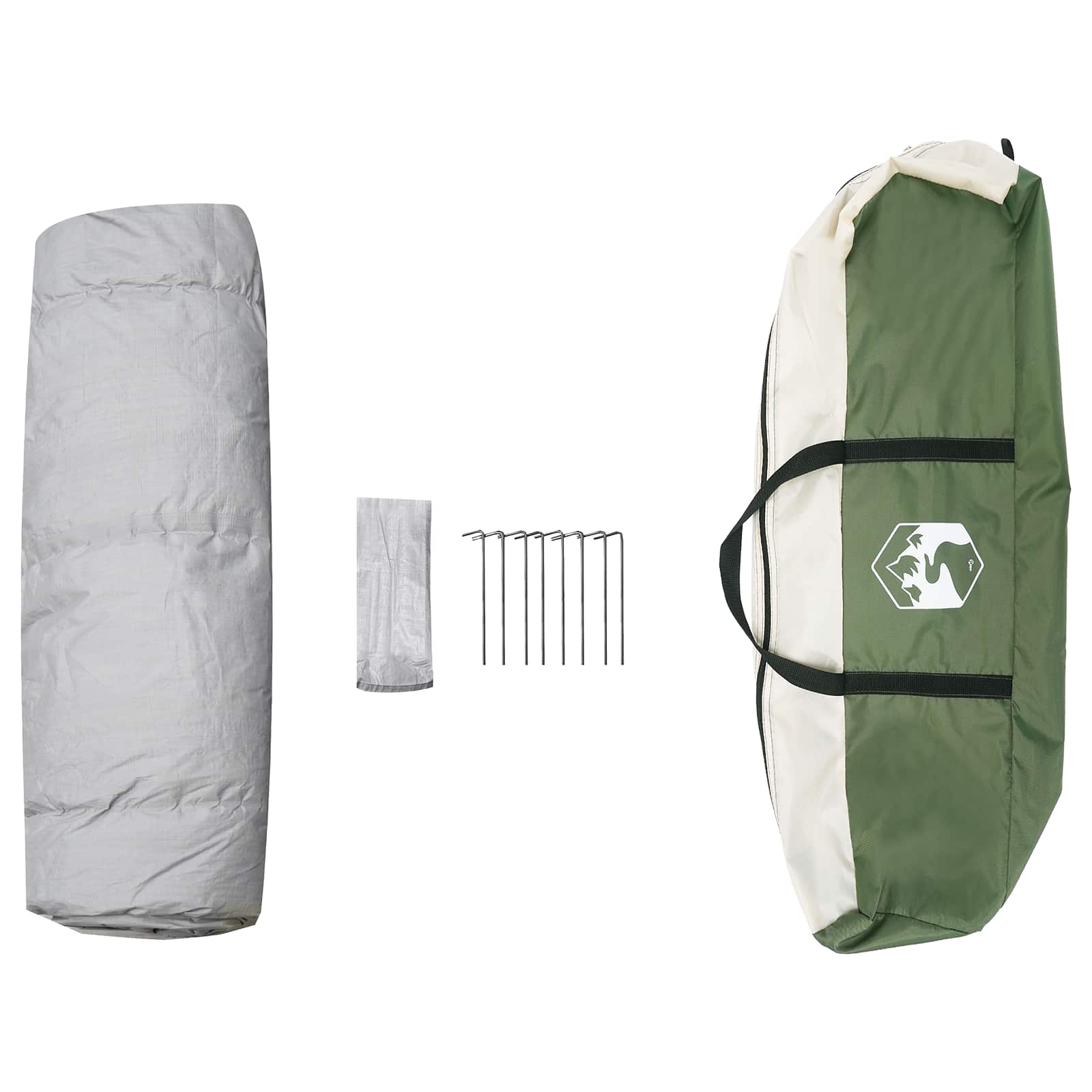 • Olennainen tarvikkeiden paketti Tämä teltta sisältää kaiken tarvittavan pystyttämiseen, kuten neljä narua ja kahdeksan paalua, jotka pitävät teltan paikoillaan. Mukana on myös kätevä kantopussi ja paalupussi, mikä helpottaa kuljetusta.