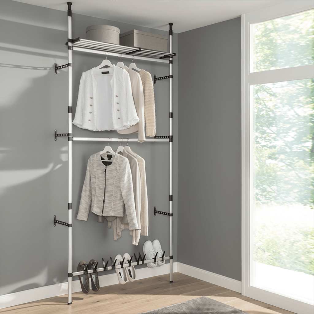 Teleskooppinen vaatekaappijärjestelmä on valmistettu alumiinista, joten se on vahva ja vankka. Teleskooppijärjestelmän ja säädettävän korkeutensa ja leveytensä ansiosta tämä säilytysteline mukautuu monenlaisiin tiloihin. Se tarjoaa ainutlaatuisen ja nerokkaan tavan järjestää vaatekaapin sisältö.