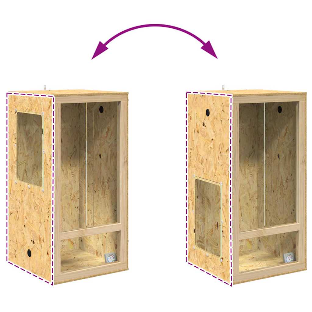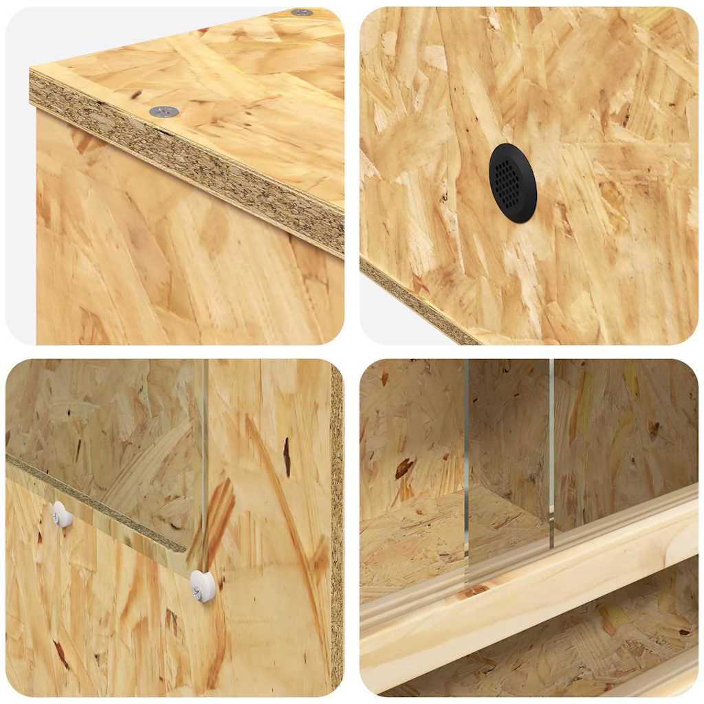 • Kestävät materiaalit: Terraario rakennettu pääasiassa OSB:stä, joka on vahva ja nätiltä näyttävä. Vankat OSB-paneelit varmistavat, ettei rakenne heikkene, vaikka lemmikkisi olisivat energisiä. Karaistun lasin ovet lisäävät tyyliä ja varmistavat turvallisuuden.