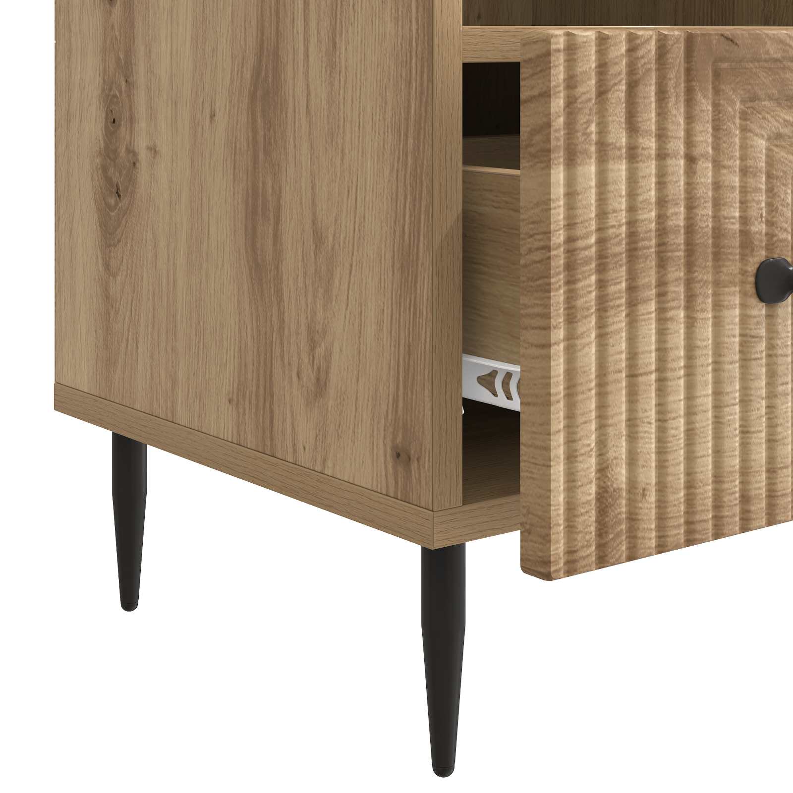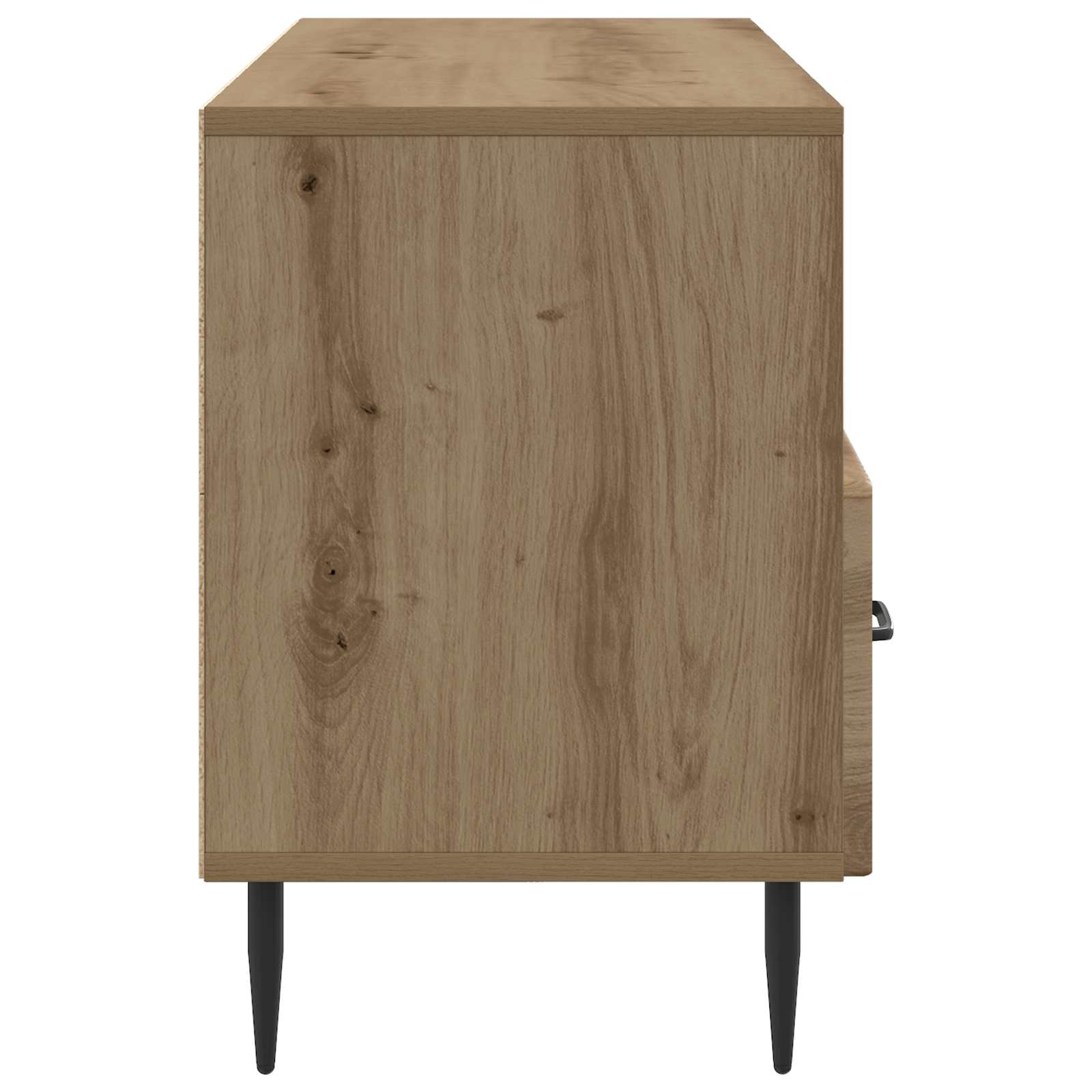 • Tyylikkäät metallijalat: Kaappi seisoo tyylikkäiden, kapenevien mustien metallijalkojen varassa, jotka antavat sille tukevan pohjan lisäämällä samalla kaapin viehättävyyttä. Nämä jalat helpottavat siivousta pitäen kalusteen korkealla.