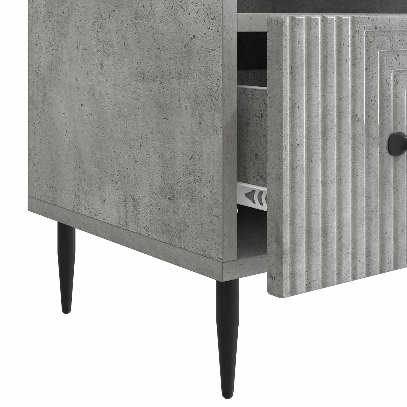 • Tyylikkäät metallijalat: Kaappi seisoo tyylikkäiden, kapenevien mustien metallijalkojen varassa, jotka antavat sille tukevan pohjan lisäämällä samalla kaapin viehättävyyttä. Nämä jalat helpottavat siivousta pitäen kalusteen korkealla.