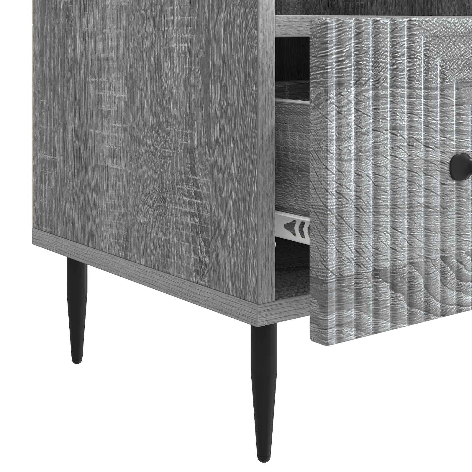• Tyylikkäät metallijalat: Kaappi seisoo tyylikkäiden, kapenevien mustien metallijalkojen varassa, jotka antavat sille tukevan pohjan lisäämällä samalla kaapin viehättävyyttä. Nämä jalat helpottavat siivousta pitäen kalusteen korkealla.