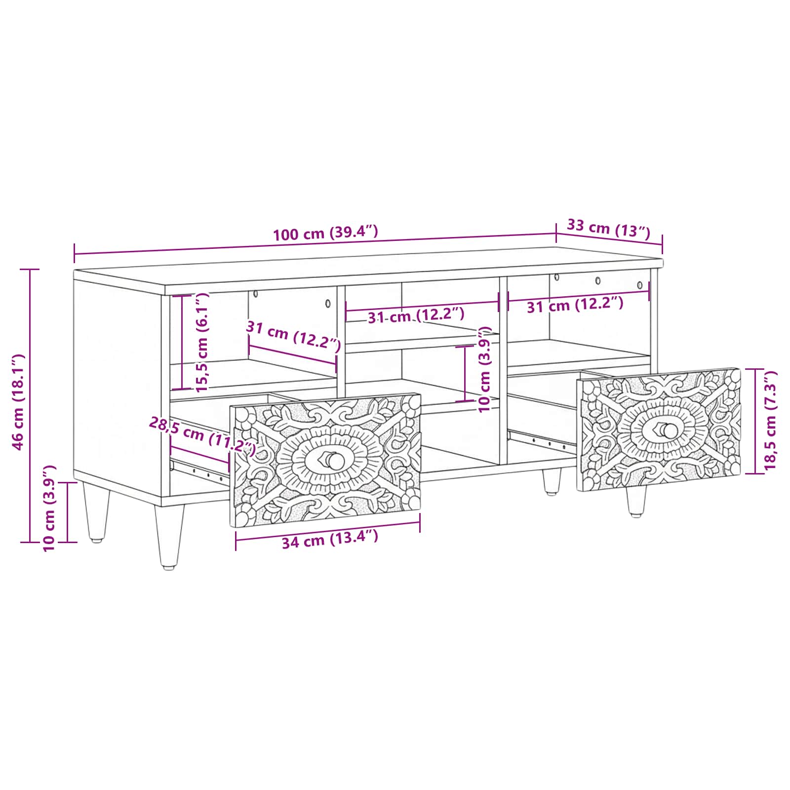 • Runsas säilytys: Rikkaita säilytystiloja multimedia-laitteille ja tarvikkeille, joten kaappi pysyy aina järjestyksessä. Olitpa sitten intohimoinen elokuvan katselija tai vain satunnainen katsoja, säilytystilat pitävät kaiken käden ulottuvilla.