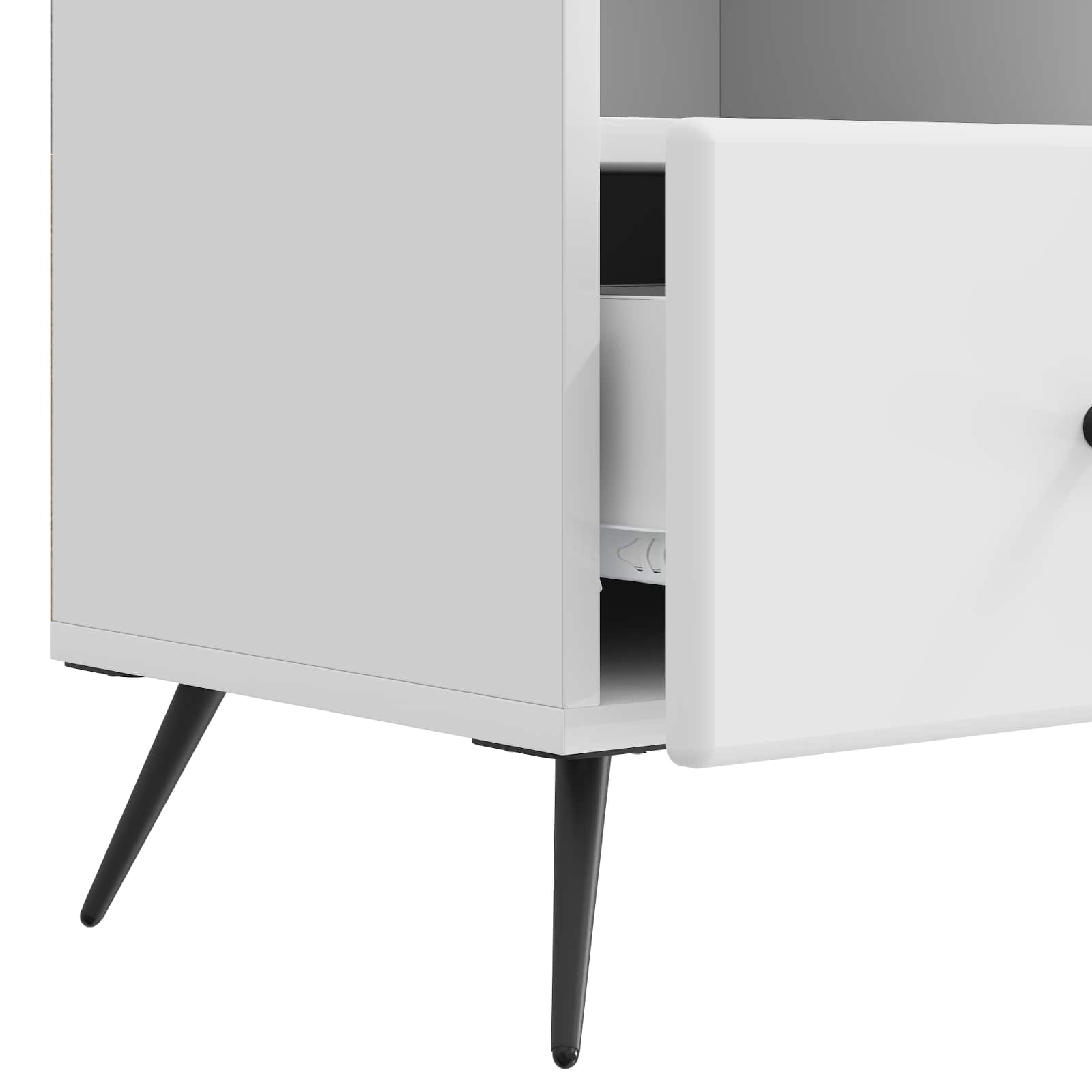 • Toimiva säilytys: Tää viihdekeskus on varustettu monilla lokeroilla, joten mediasyötteet pysyy tosi hyvin järjestettyinä. Siinä on hyllyjä, jotka sopii loistavasti pelikonsolille tai kaiuttimille, ja laatikot taas pitää kaukosäätimet ja pienemmät jutut piilossa. Reilun muotoilun ansiosta suorituskyky ja komeus kohtaa, joten voit esittää koriste-esineet tyylikkäästi.