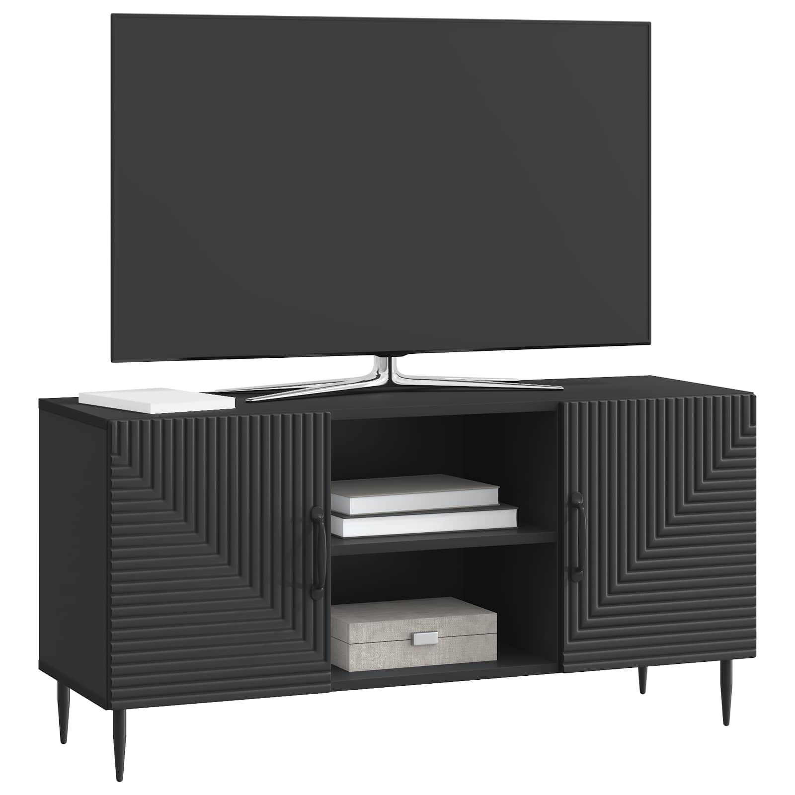 • Runsaasti sisäistä säilytystilaa: TV-kaapissa on paljon tilaa, joka mahdollistaa erilaisten asioiden, kuten kirjojen ja elektroniikan, säilyttämisen. Säädettävät hyllyt tekevät siitä helppokäyttöisen ja joustavan.
