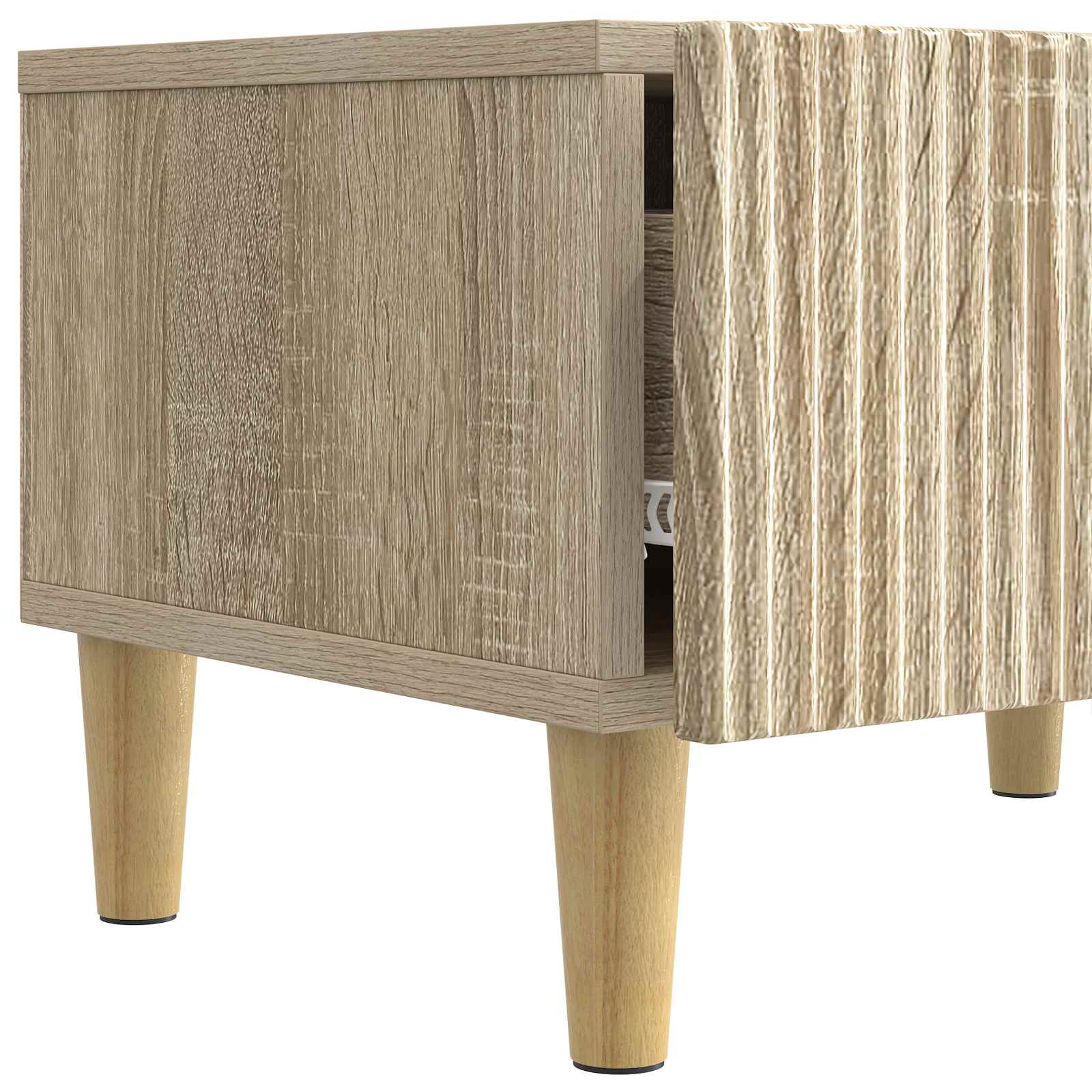 • Toiminnalliset suunnittelun piirteet: Viihdekeskuksessa on säädettäviä hyllyjä, jotka tarjoavat joustavuutta eri mediasisältöjen koon mukaan. Tämä mukautuvuus antaa käyttäjälle mahdollisuuden räätälöidä yksikkö omien tarpeidensa mukaiseksi, optimoi tilaa niin pienille laitteille kuin suuremmille, kuten pelikonsoleille ja äänijärjestelmille.