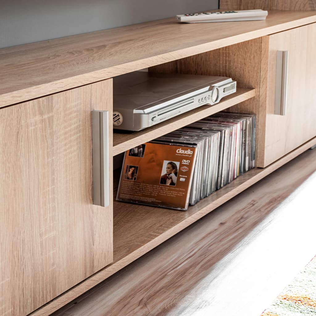 Kalusteyksikkö koostuu kahdesta erikokoisesta sivukaapista, TV-tasosta ja vitriinikaapista, se tarjoaa runsaasti tilaa multimedialaitteiden, DVD-soitinten, reitittimien, kirjojen sekä kaikenlaisten pientavaroiden säilyttämiseen. Siihen voi asettaa esille myös koriste-esineitä, valokuvakehyksiä tai jopa ruukkukasveja. Vasemmanpuoleisessa kaapissa on kolme lasihyllyä energiatehokkailla valkoisilla LED-valoilla, jotka luovat houkuttelevan tunnelman.
