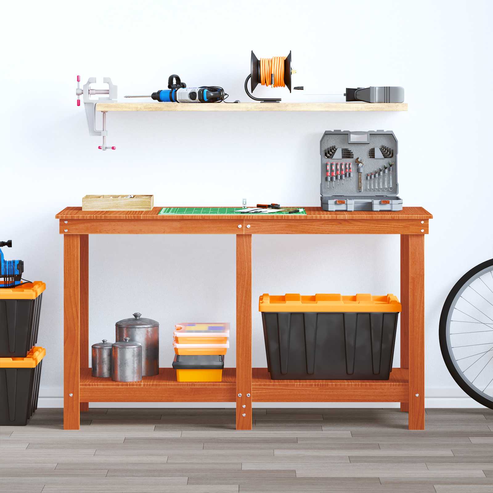 • Hyllytilaa Hyllyt auttavat järjestämään työkaluja ja materiaaleja, jolloin työtilasta tulee siisti ja tehokas. Nämä hyllyt mahdollistavat erilaisten esineiden järkevästi säilyttämisen. Siisti työtila parantaa tehokkuutta ja tuottavuutta.