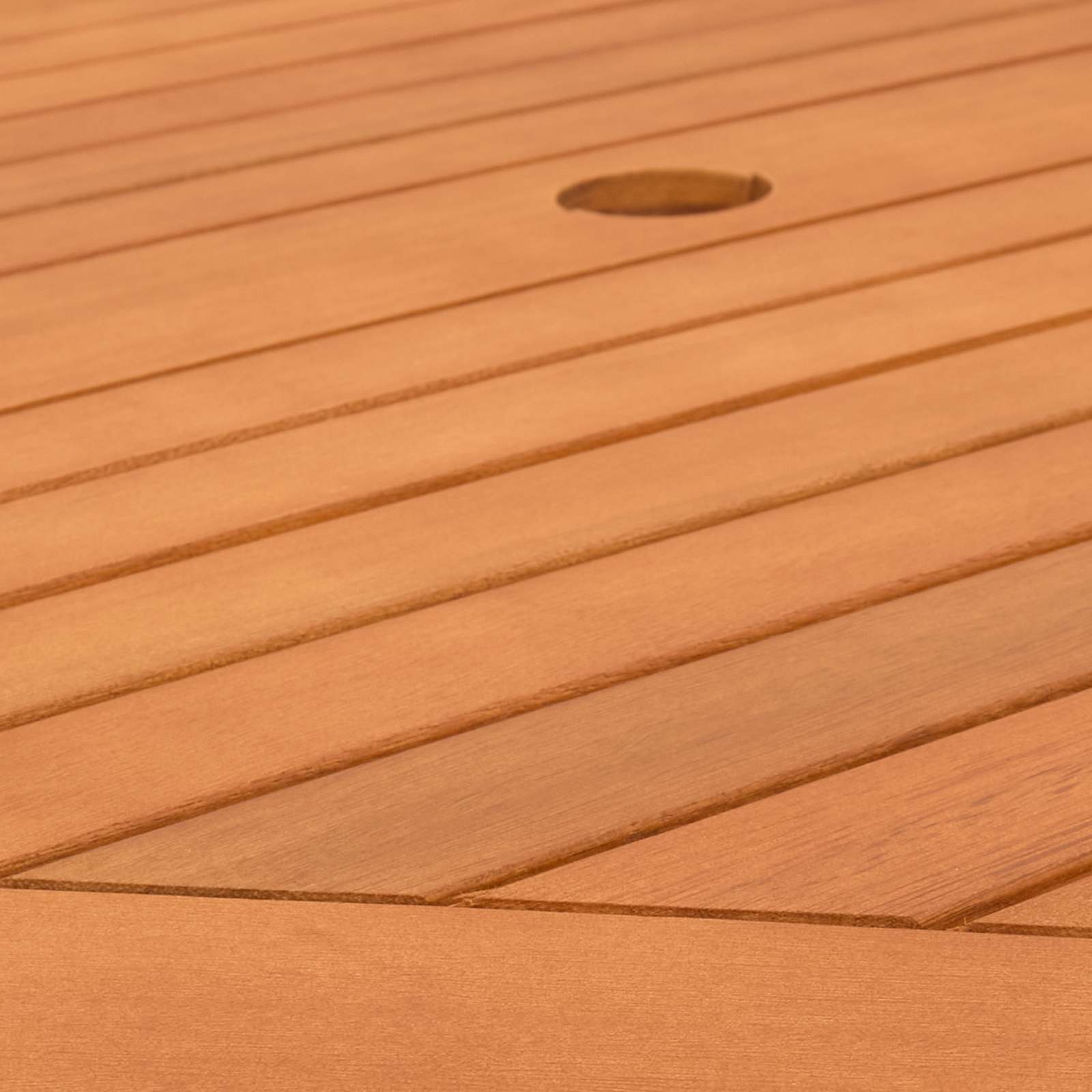 • Nykyaikainen Tyyli: Selkeät linjat ja luonnollinen puupinta luovat modernin ilmeen. Pöydässä on aurinkovarjon reikä, mikä on kätevä aurinkoisina päivinä.