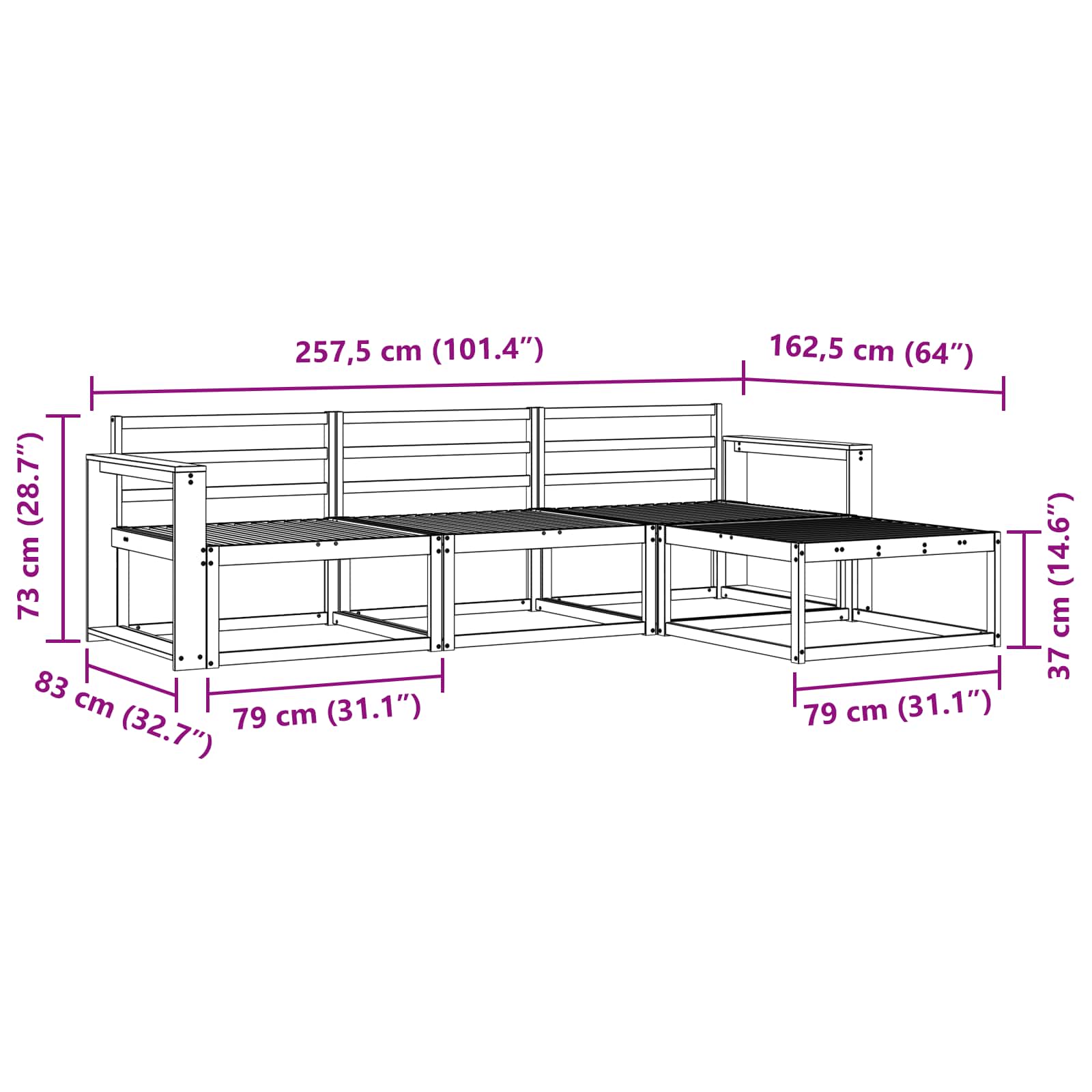 • 3 x Keskisohva: 79 x 83 x 73 cm (P x L x K)