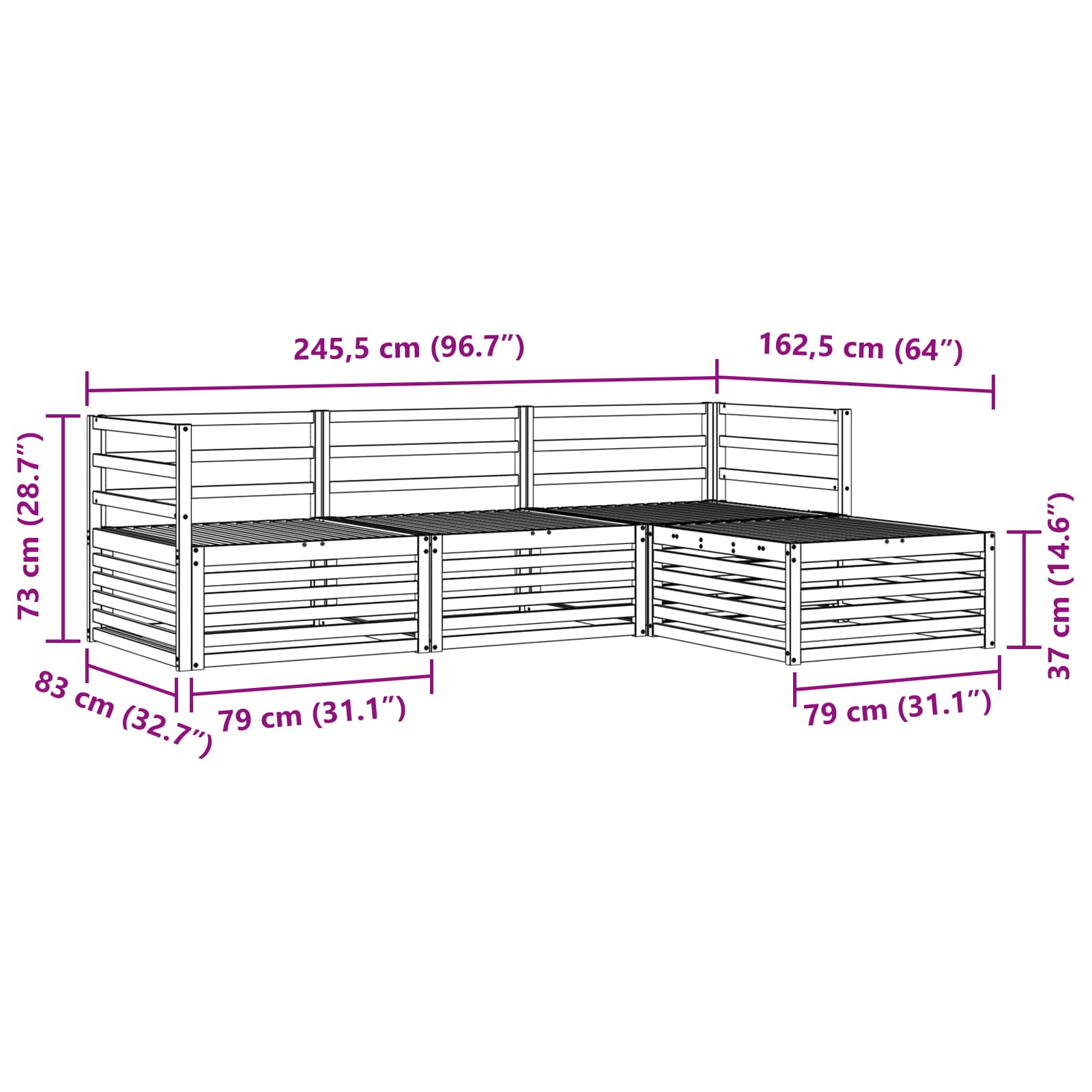 • Yleiset mitat: 245,5 x 162,5 x 73 cm (P x L x K)