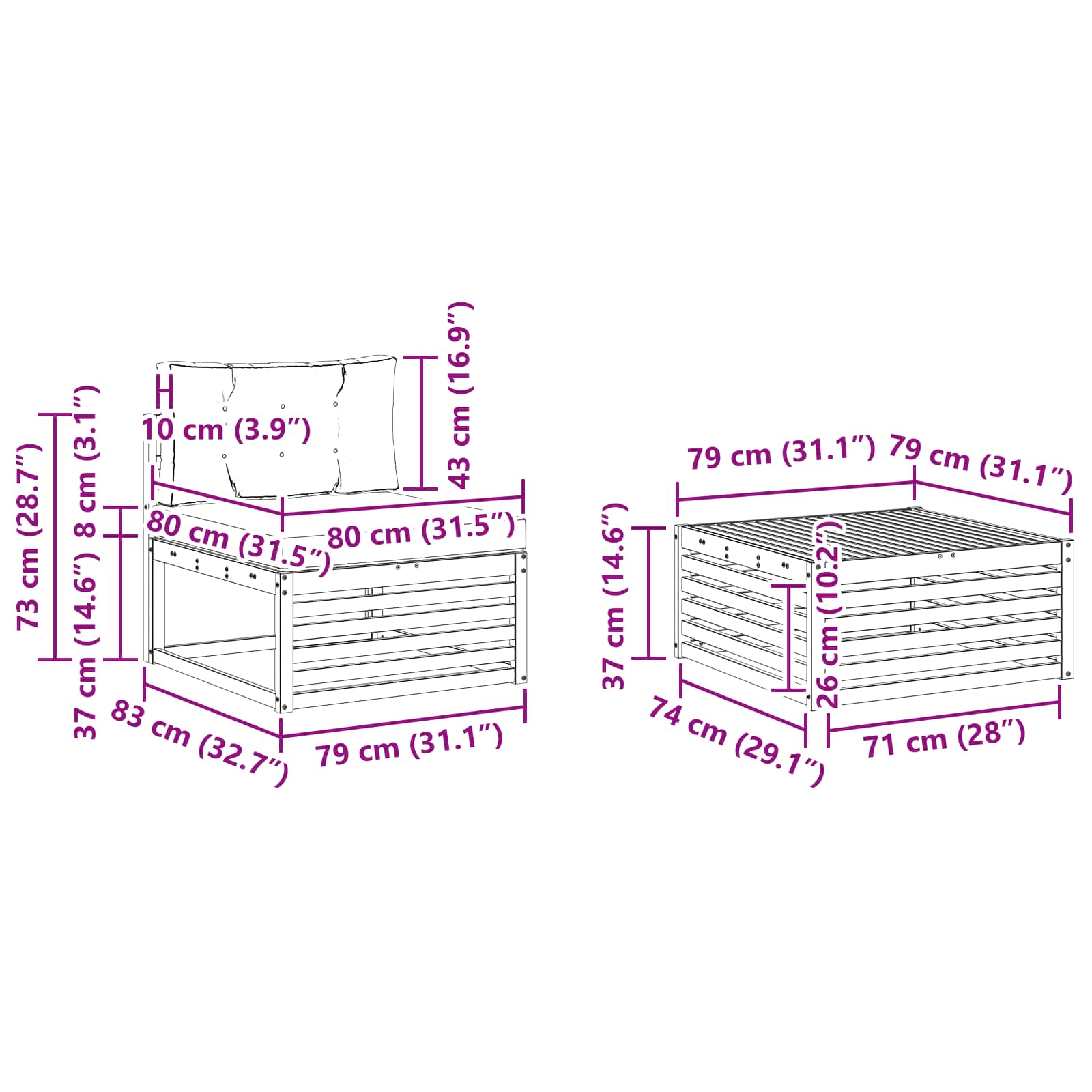 • Mukavuus ja monipuolisuus: Modulaarinen muotoilu antaa mahdollisuuden joustaviin asetuksiin eri tiloille ja tarpeille. Sopii erinomaisesti rentoutumiseen, sosiaalisiin tilaisuuksiin tai rauhallisiin hetkiin, tämä setti mukautuu mihin tahansa ulkoiseen ympäristöön maksimoiden mukavuuden.