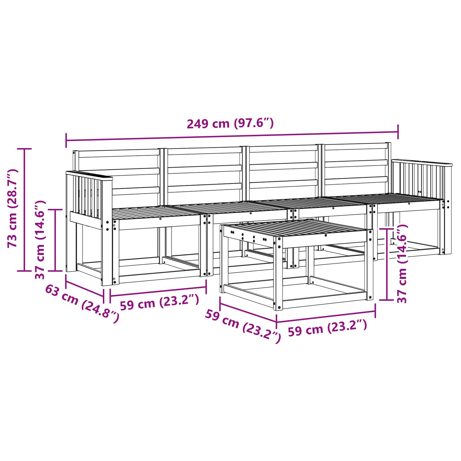 • 4 x Keskisohva: 59 x 63 x 73 cm (P x L x K)