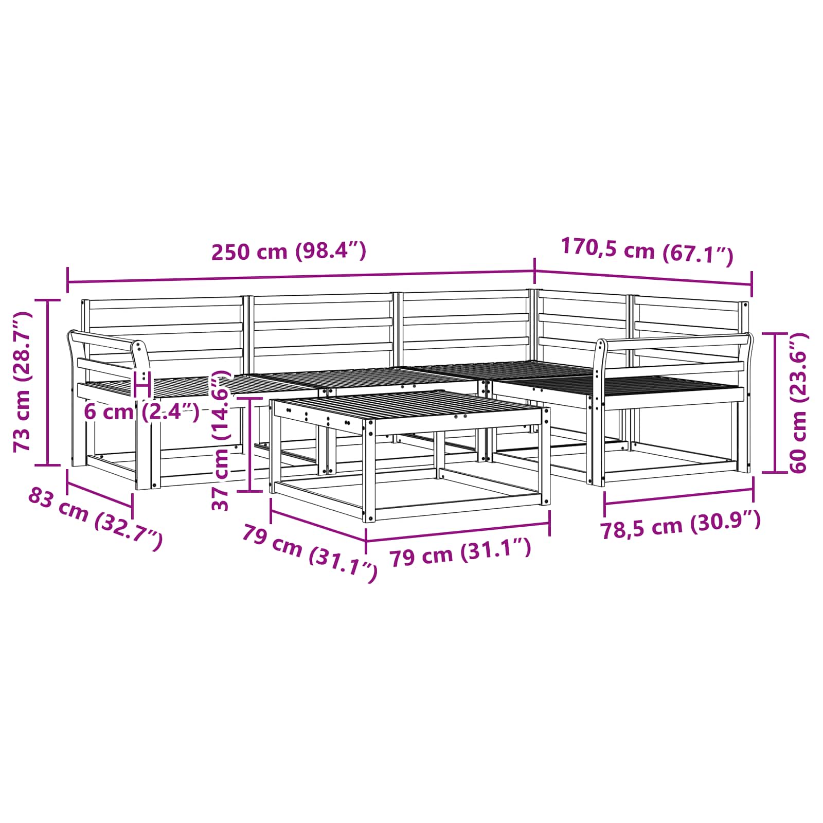 • 3 x Keskisohva: 79 x 83 x 73 cm (P x L x K)