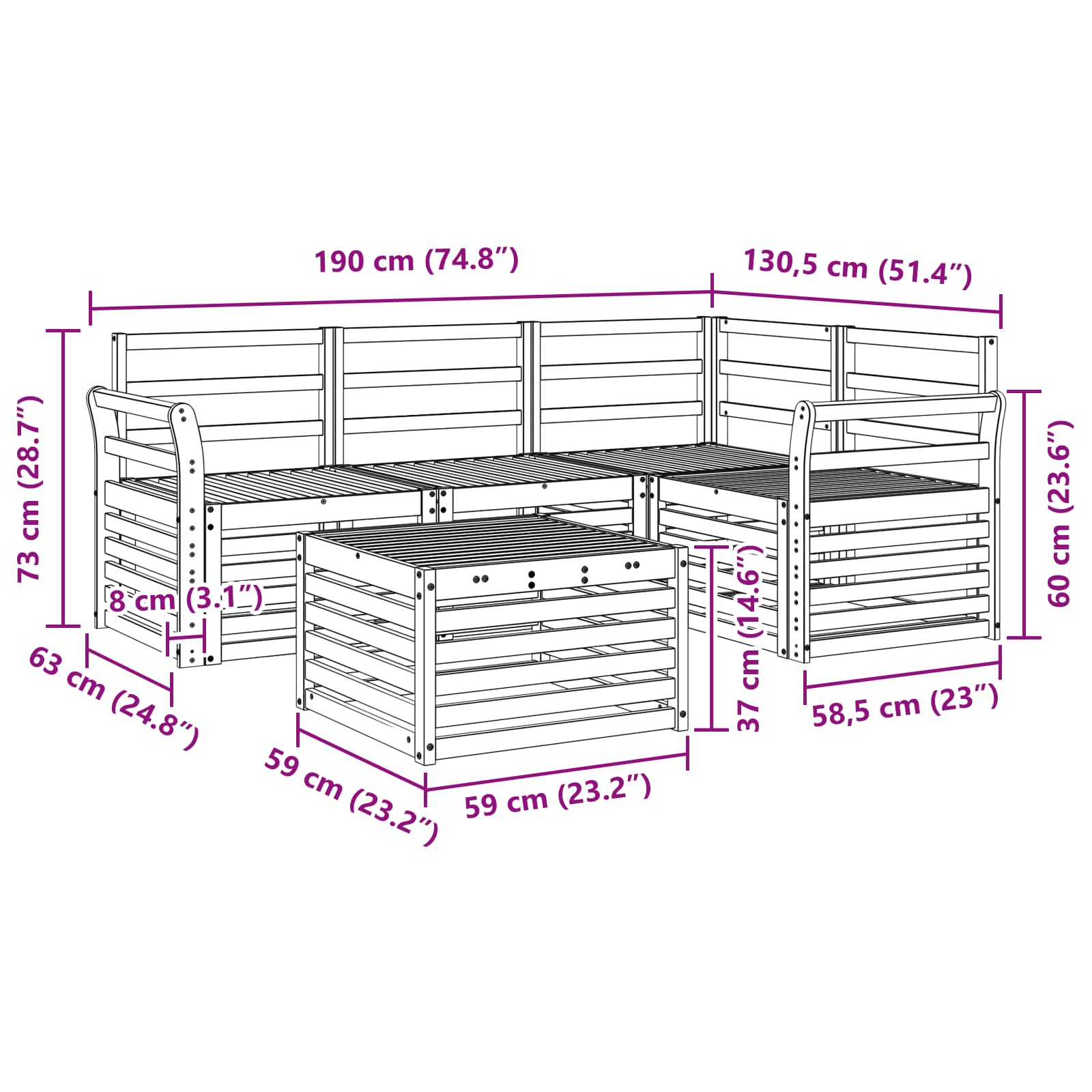 • 1 x Kulmasohva: 63 x 63 x 73 cm (P x L x K)