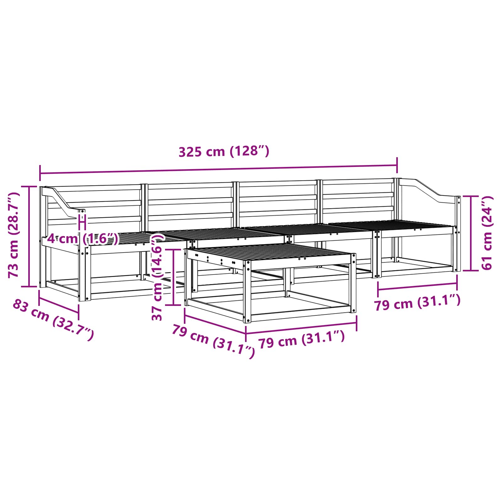 • 4 x Keskituhka: 79 x 83 x 73 cm (P x L x K)