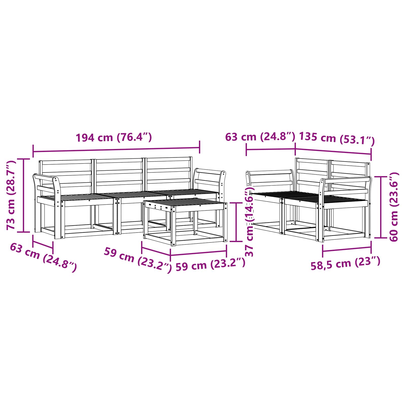 • 5 x Keskikokoista sohvaa: 59 x 63 x 73 cm (P x L x K)