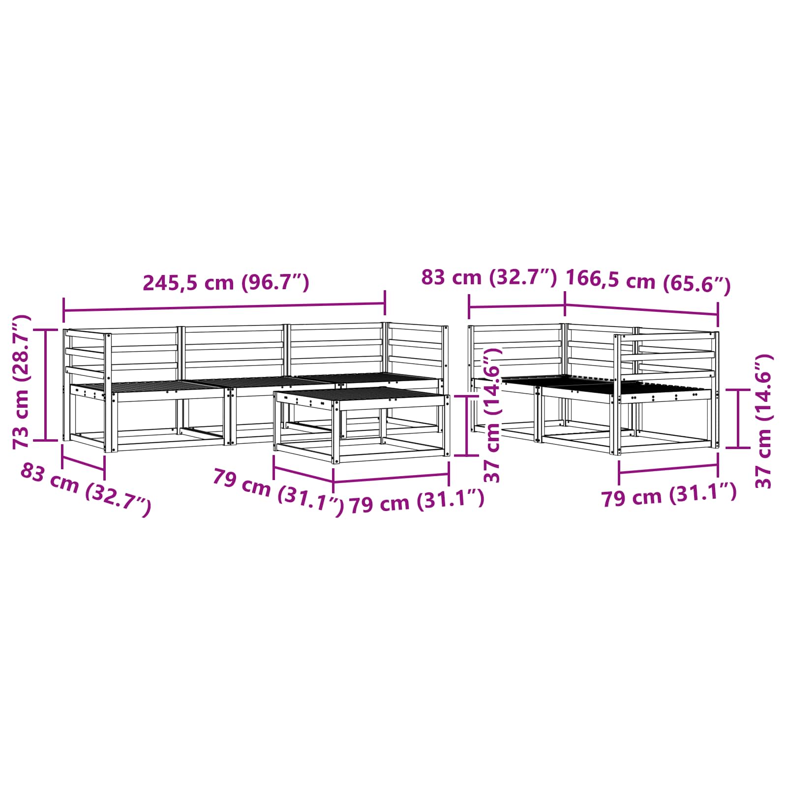 • 5 kpl Keskisohva: 79 x 83 x 73 cm (P x L x K)