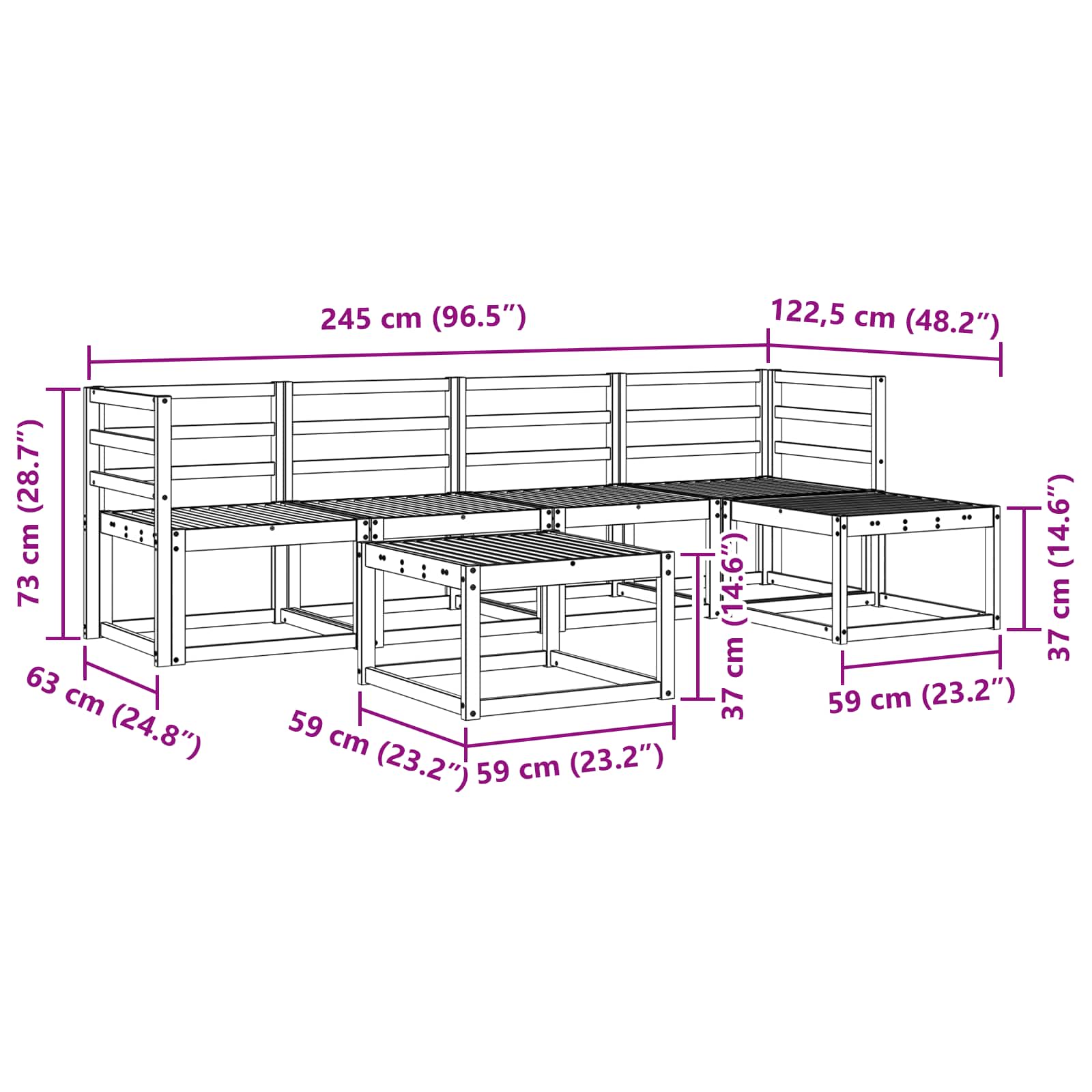 • 4 x Keskisohva: 59 x 63 x 73 cm (P x L x K)