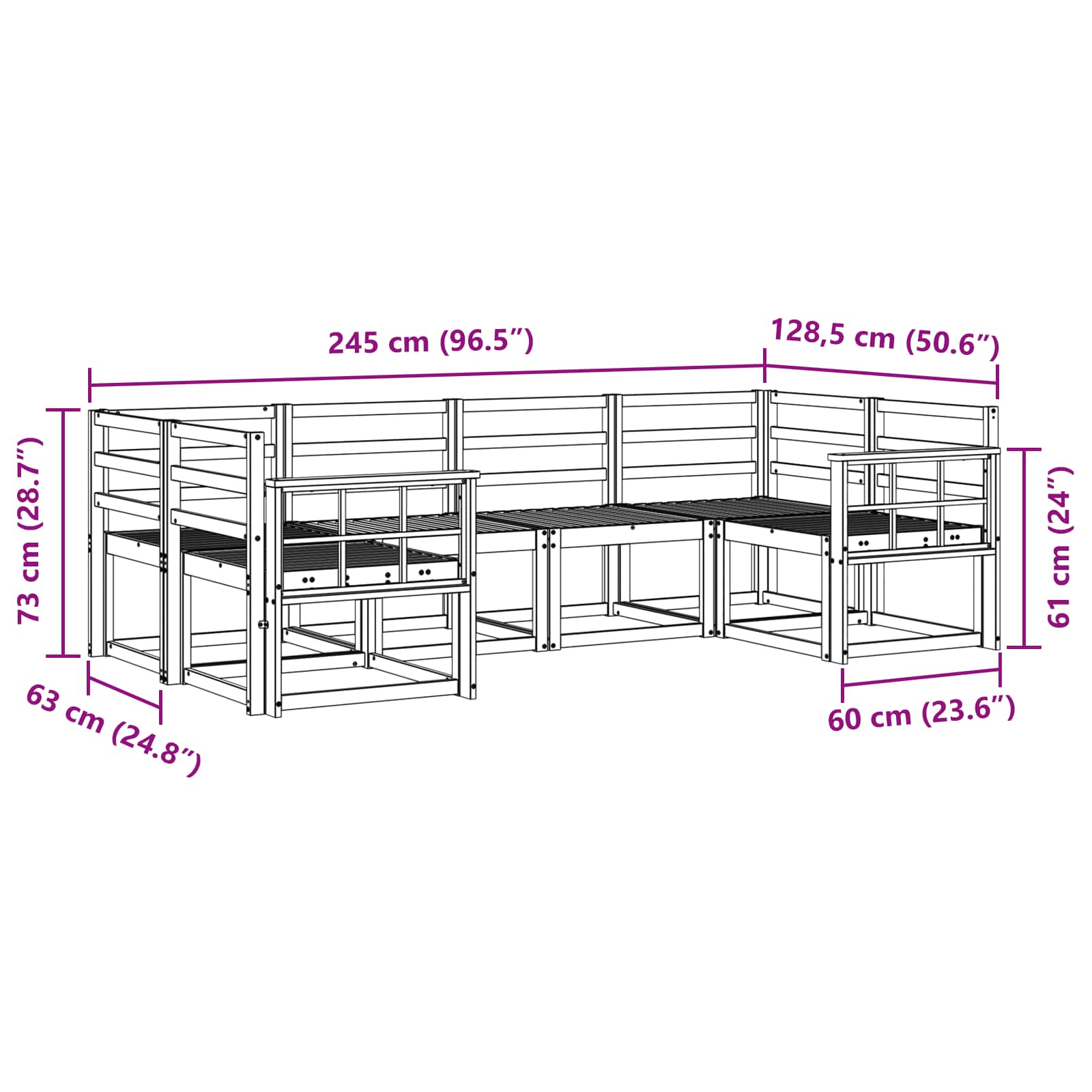 • Yleiset mitat: 245 x 128,5 x 73 cm (P x L x K)