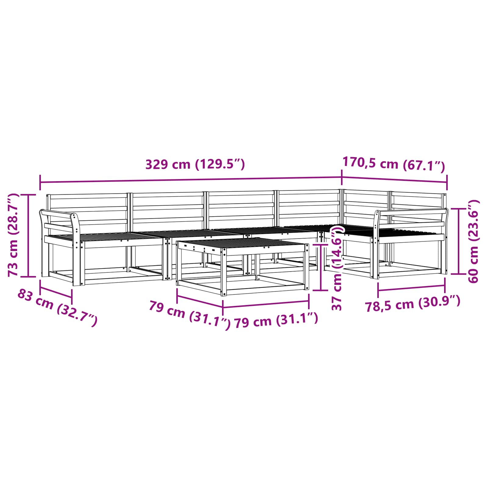 • 4 x Keskisohva: 79 x 83 x 73 cm (P x L x K)