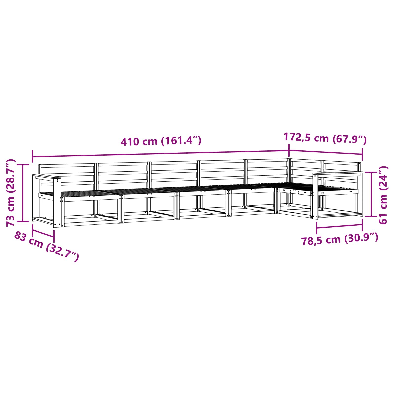 • Yleiset mitat: 410 x 172,5 x 73 cm (P x L x K)