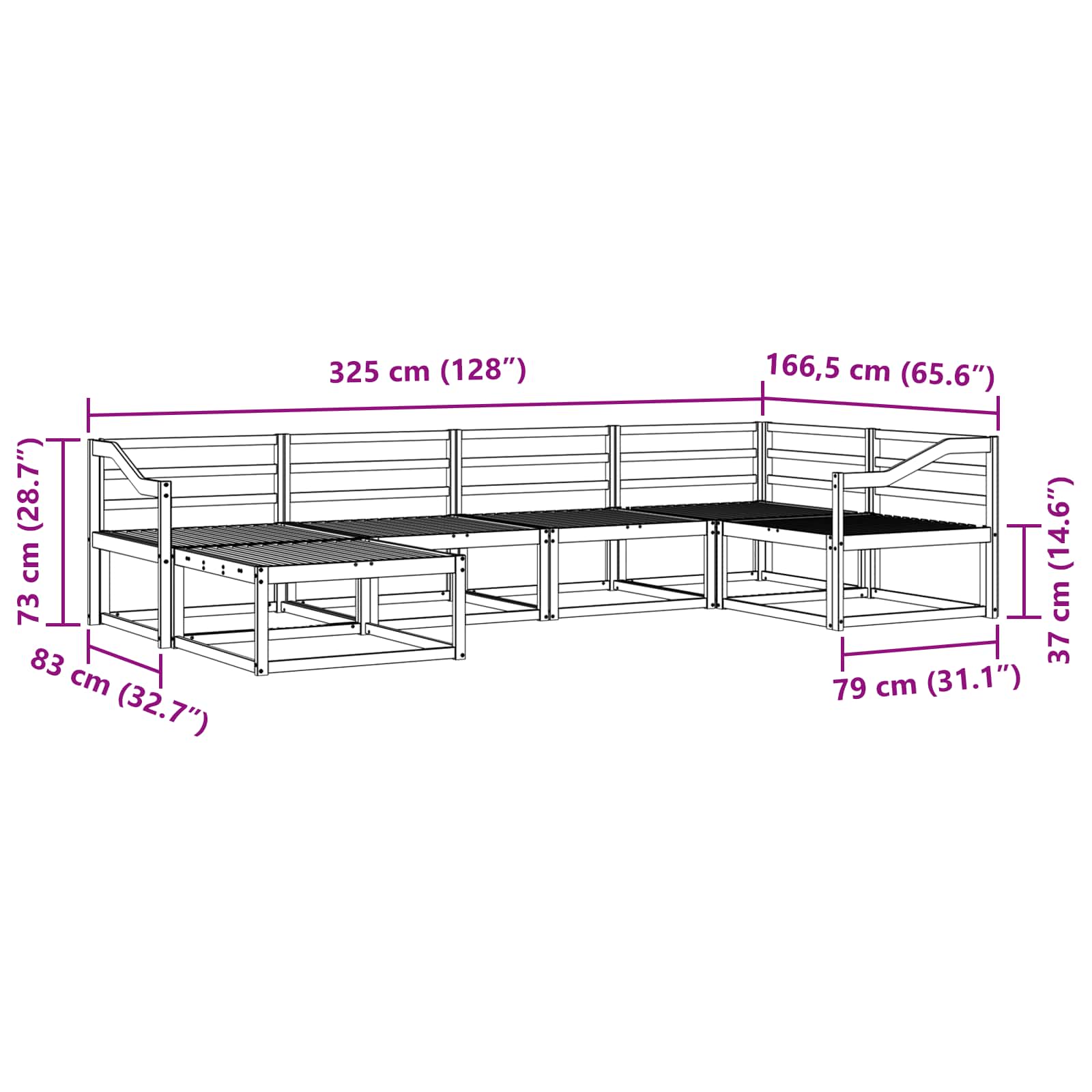 • Yleiset mitat: 325 x 166,5 x 73 cm (P x L x K)