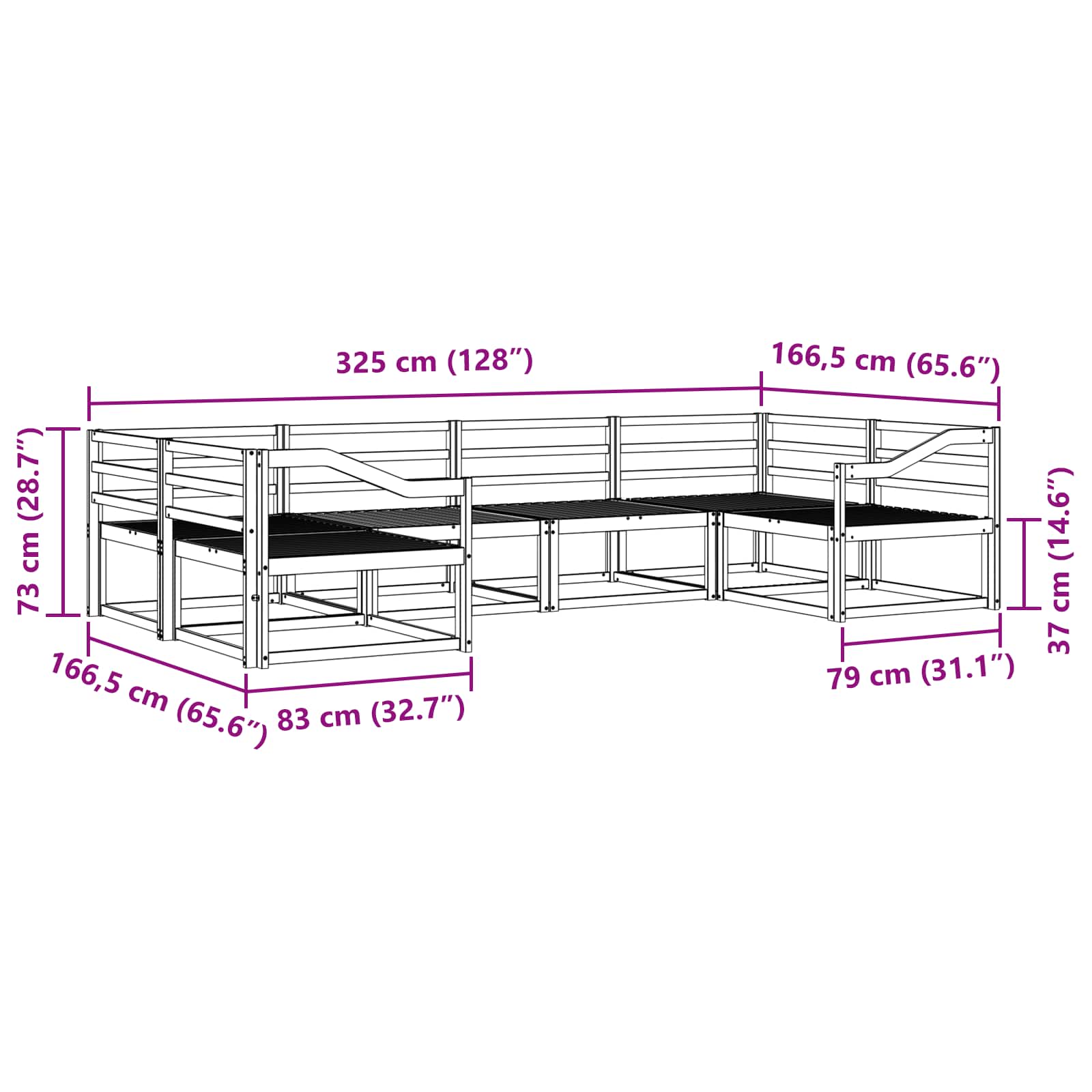 • Yleiset mitat: 325 x 166,5 x 73 cm (P x L x K)