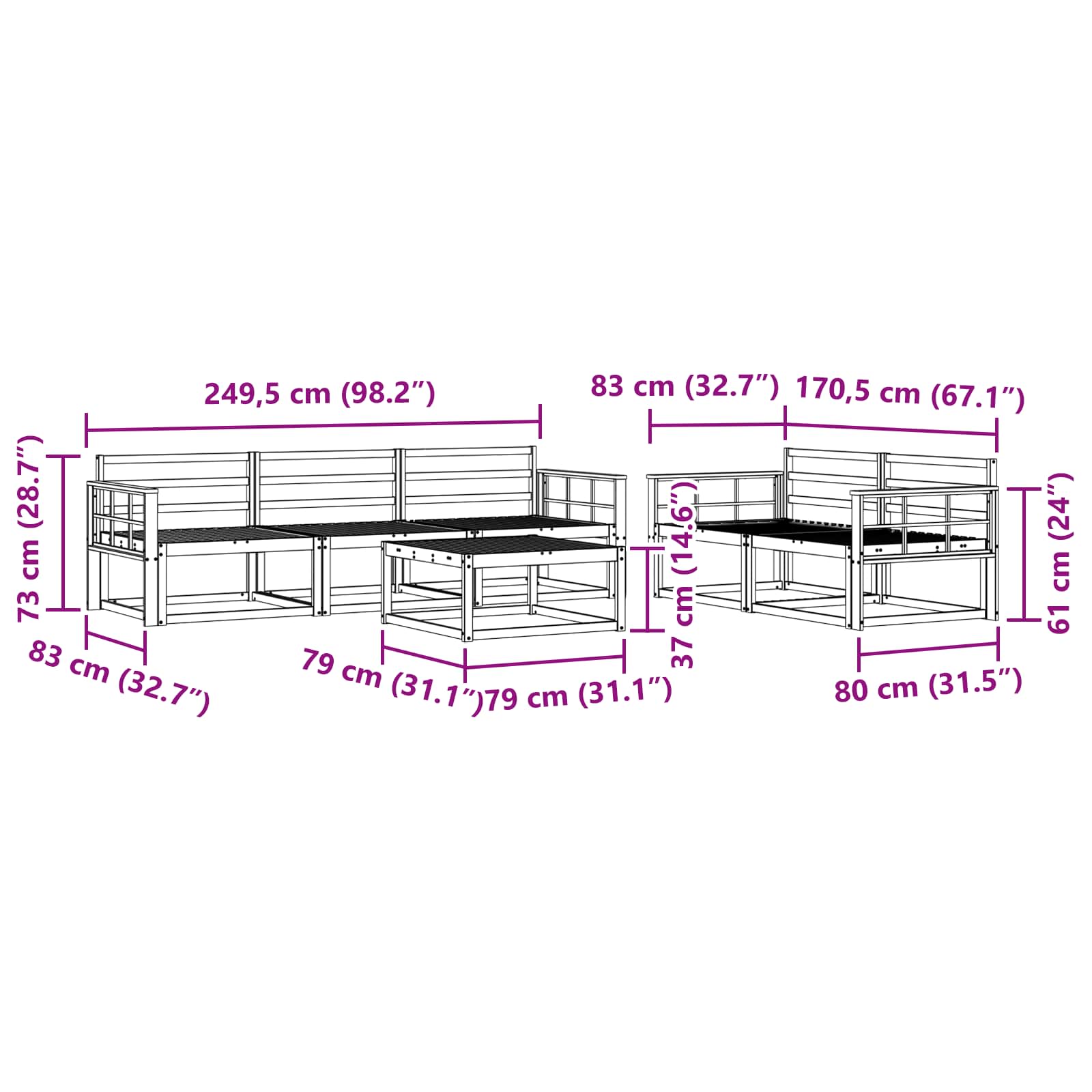 • 5 kpl Keskisohva: 79 x 83 x 73 cm (P x L x K)