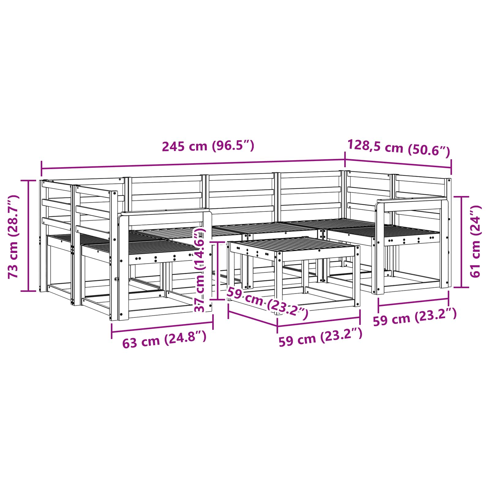 • 4 x Keskisohva: 59 x 63 x 73 cm (P x L x K)