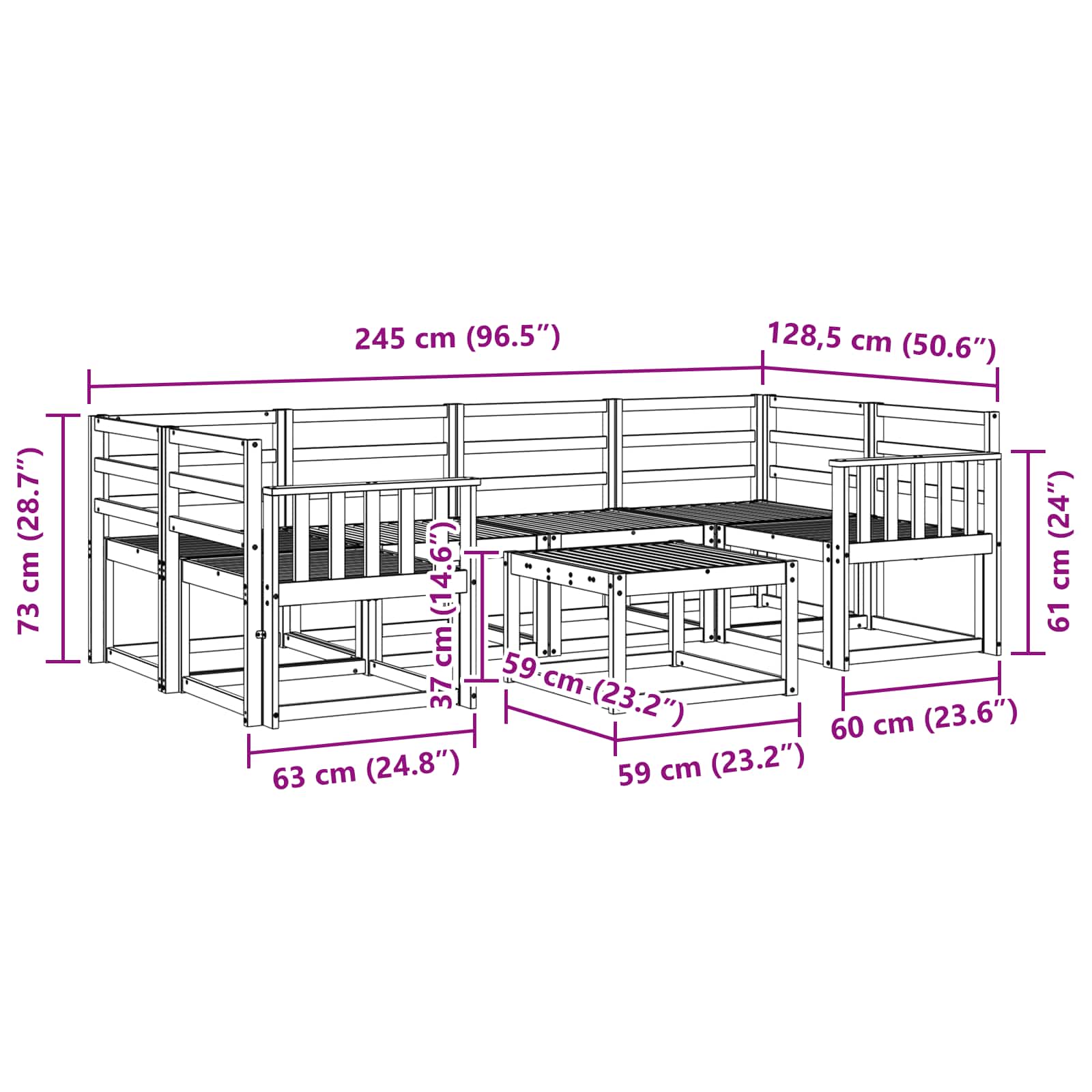 • 4 x Keskisohva: 59 x 63 x 73 cm (P x L x K)