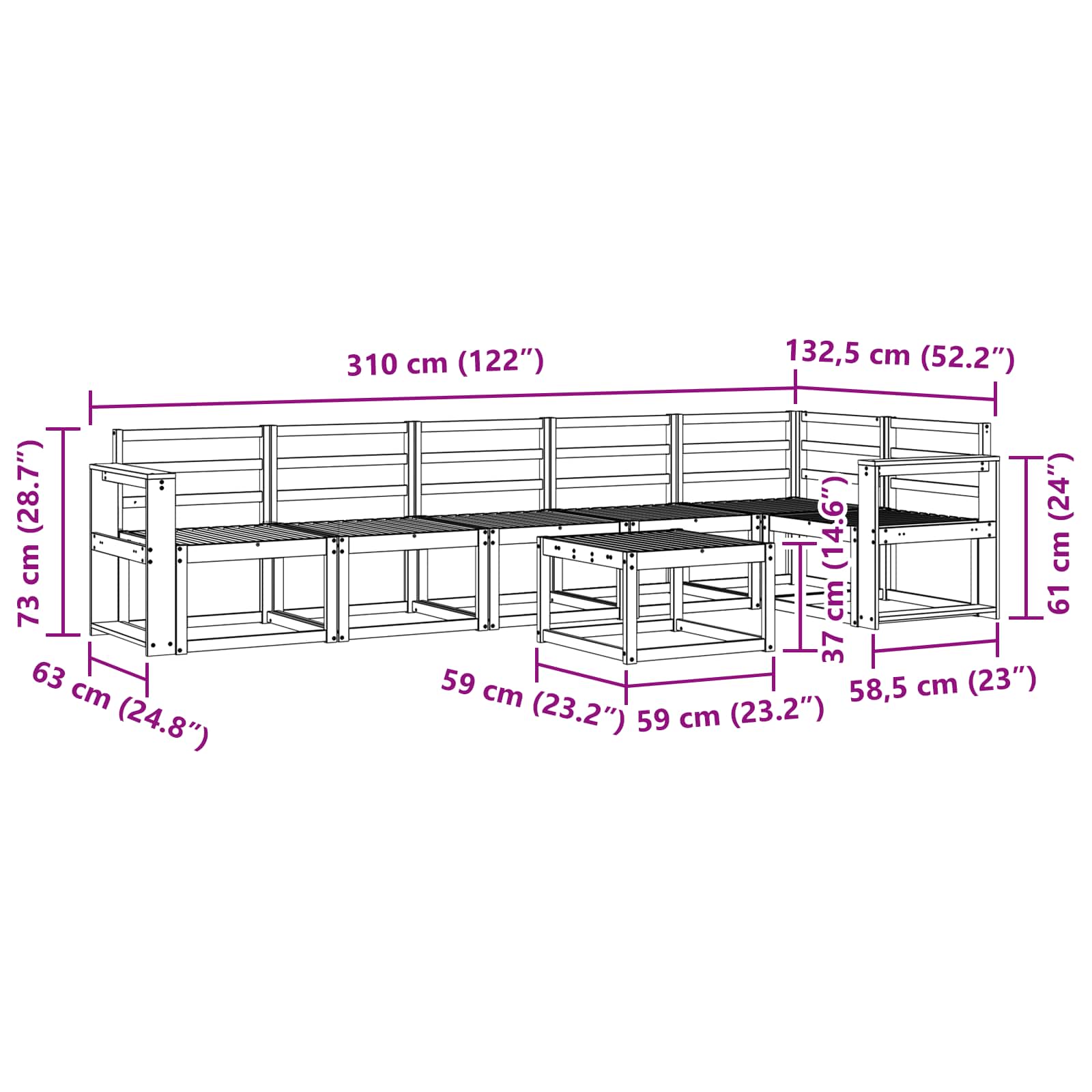 • 5 x Keskisohva: 59 x 63 x 73 cm (P x L x K)