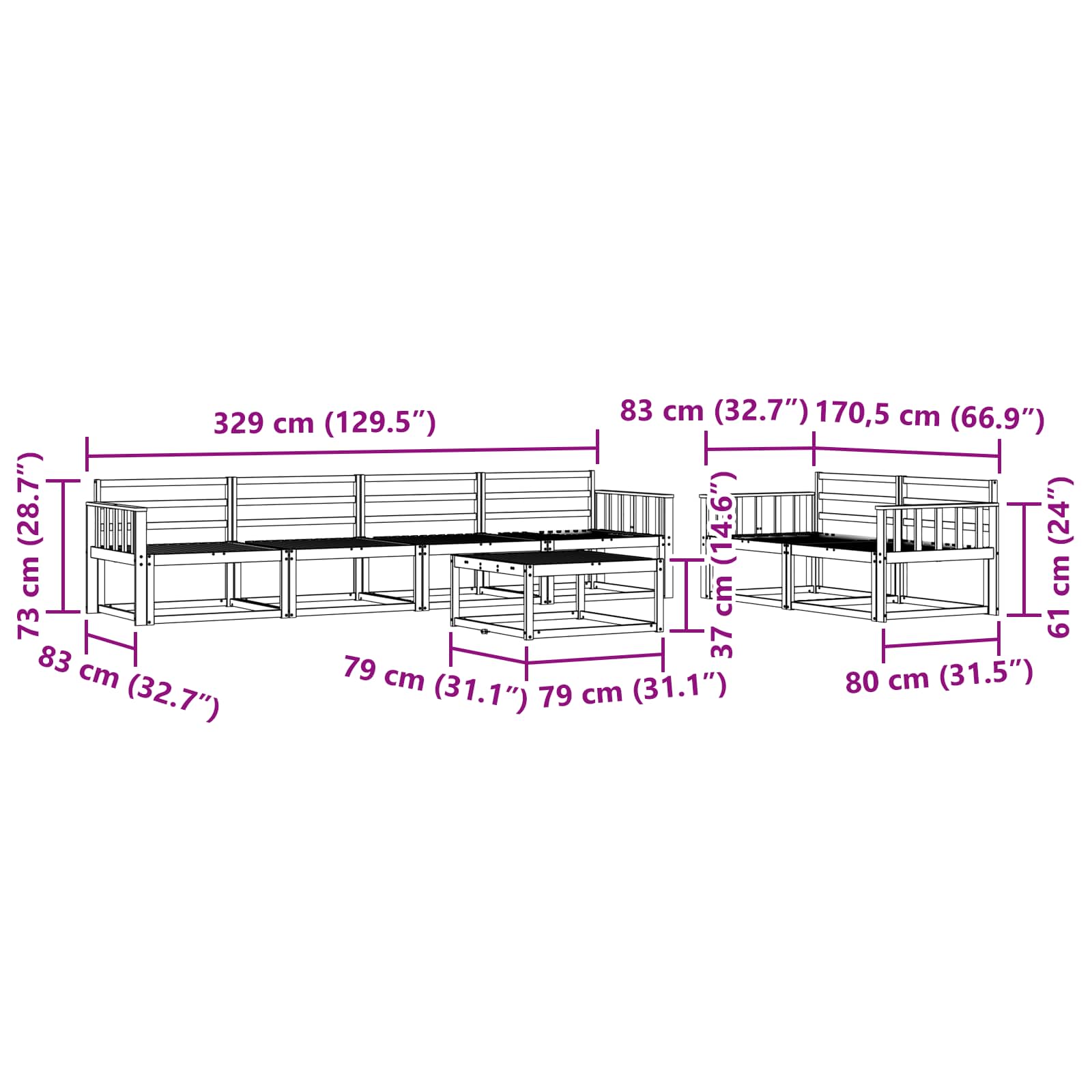 • 6 x Keskisohva: 79 x 83 x 73 cm (P x L x K)