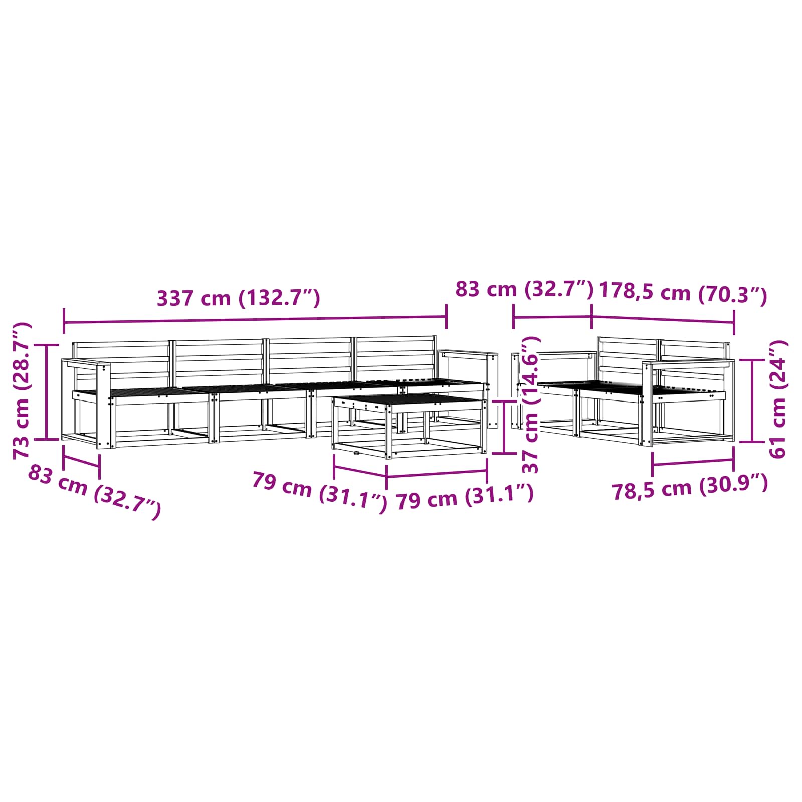 • 6 x Keskisohva: 79 x 83 x 73 cm (P x L x K)