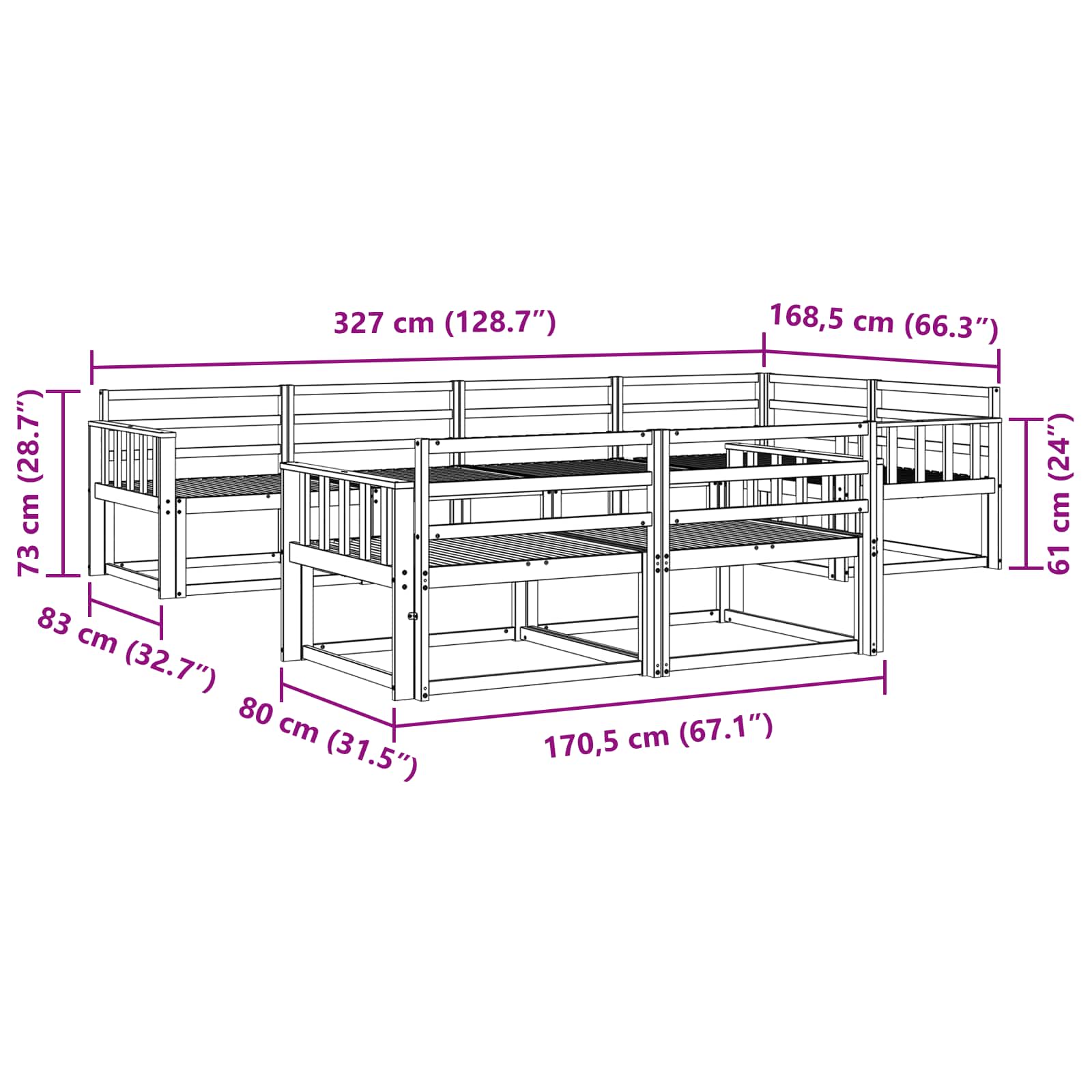 • 4 x Käsinoja: 80 x 6 x 61 cm (P x L x K)