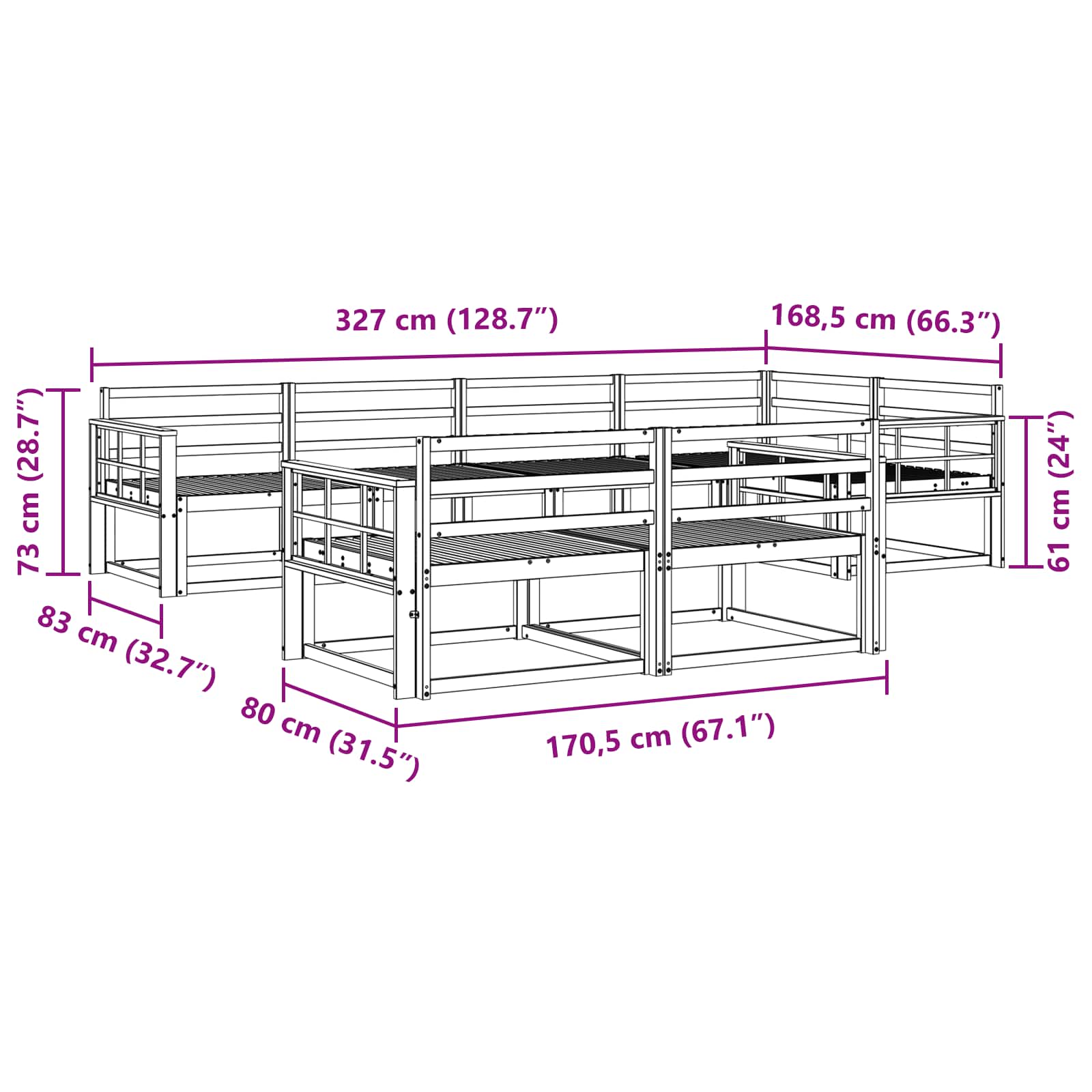 • Yleiset mitat: 327 x 168,5 x 73 cm (P x L x K)