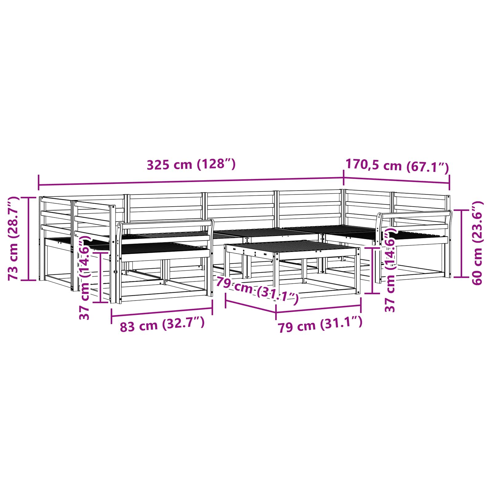 • Materiaalit: Valmistettu täysistä akaasiapuista, tää sohvasetti tuo esiin materiaalin kauneuden ja kestävyyden. Kestävä pinta on sekä houkutteleva että pitkäikäinen. Puu kestää sään vaikutuksia, joten se sopii mainiosti käytettäväksi ulkona, ja näyttää kauniilta kaikissa sääolosuhteissa.