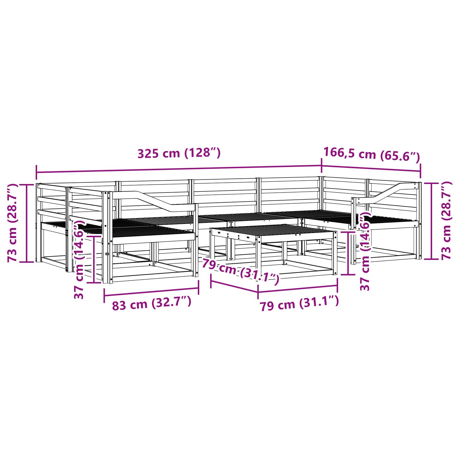 • Materiaalit: Valmistettu täysistä akaasiapuista, tää sohvasetti tuo esiin materiaalin kauneuden ja kestävyyden. Kestävä pinta on sekä houkutteleva että pitkäikäinen. Puu kestää sään vaikutuksia, joten se sopii mainiosti käytettäväksi ulkona, ja näyttää kauniilta kaikissa sääolosuhteissa.