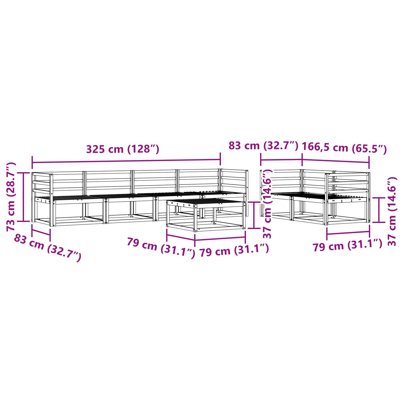 • 6 x Keskisohva: 79 x 83 x 73 cm (P x L x K)