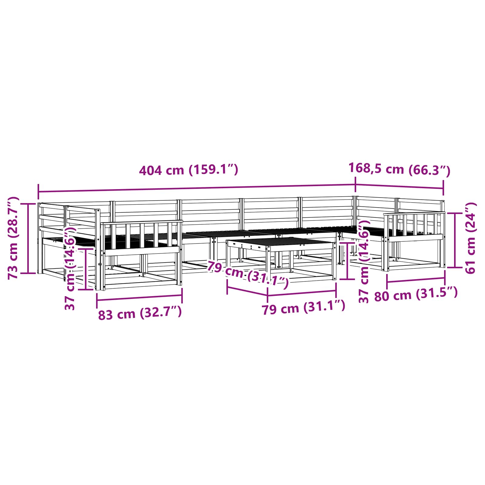 • 5 x keskiosasohva: 79 x 83 x 73 cm (P x L x K)