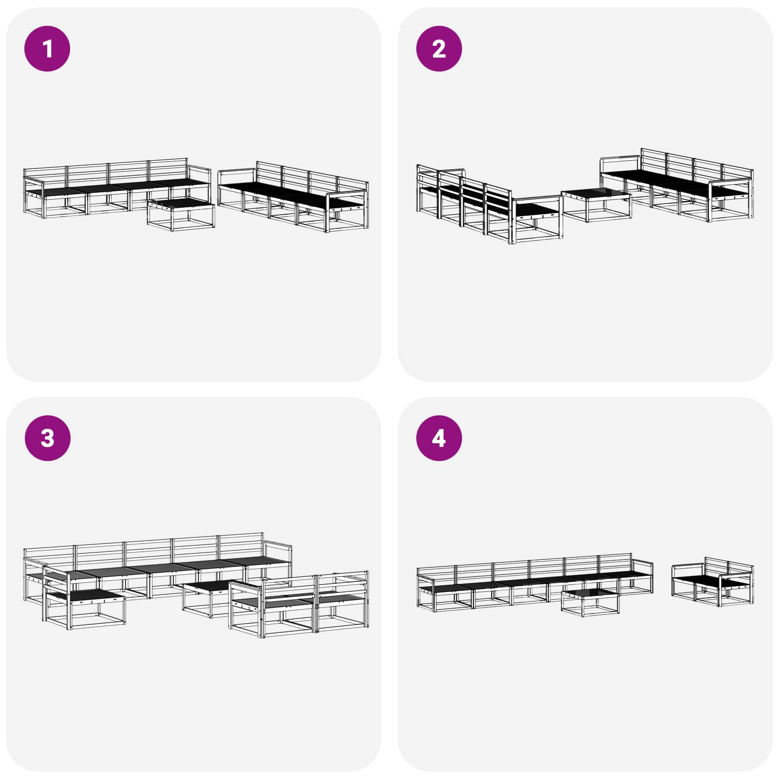 • Yksinkertainen huolto: Vaikka tämä setti on kestävä, säännöllinen huolenpito auttaa pitämään sen kauniina. Kun et käytä sitä, pidä se suojassa peitteillä ja pyyhi kostealla liinalla silloin tällöin. Näin se pysyy raikkaana ja kestää pidempään, tarjoten tyylikästä mukavuutta ulkotiloissasi.