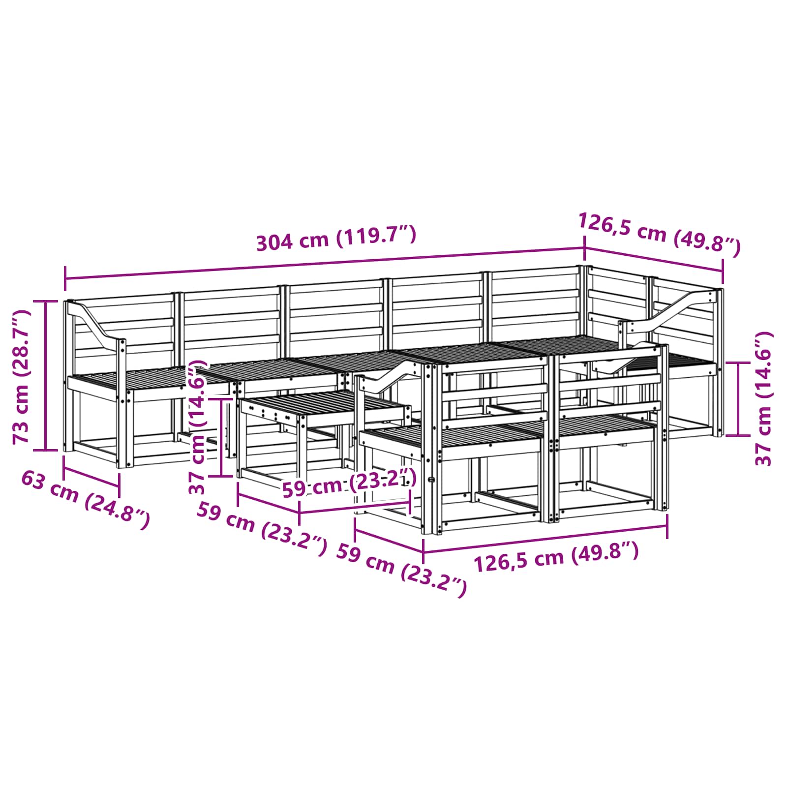 • 7 kpl keskisosohvaa: 59 x 63 x 73 cm (P x L x K)