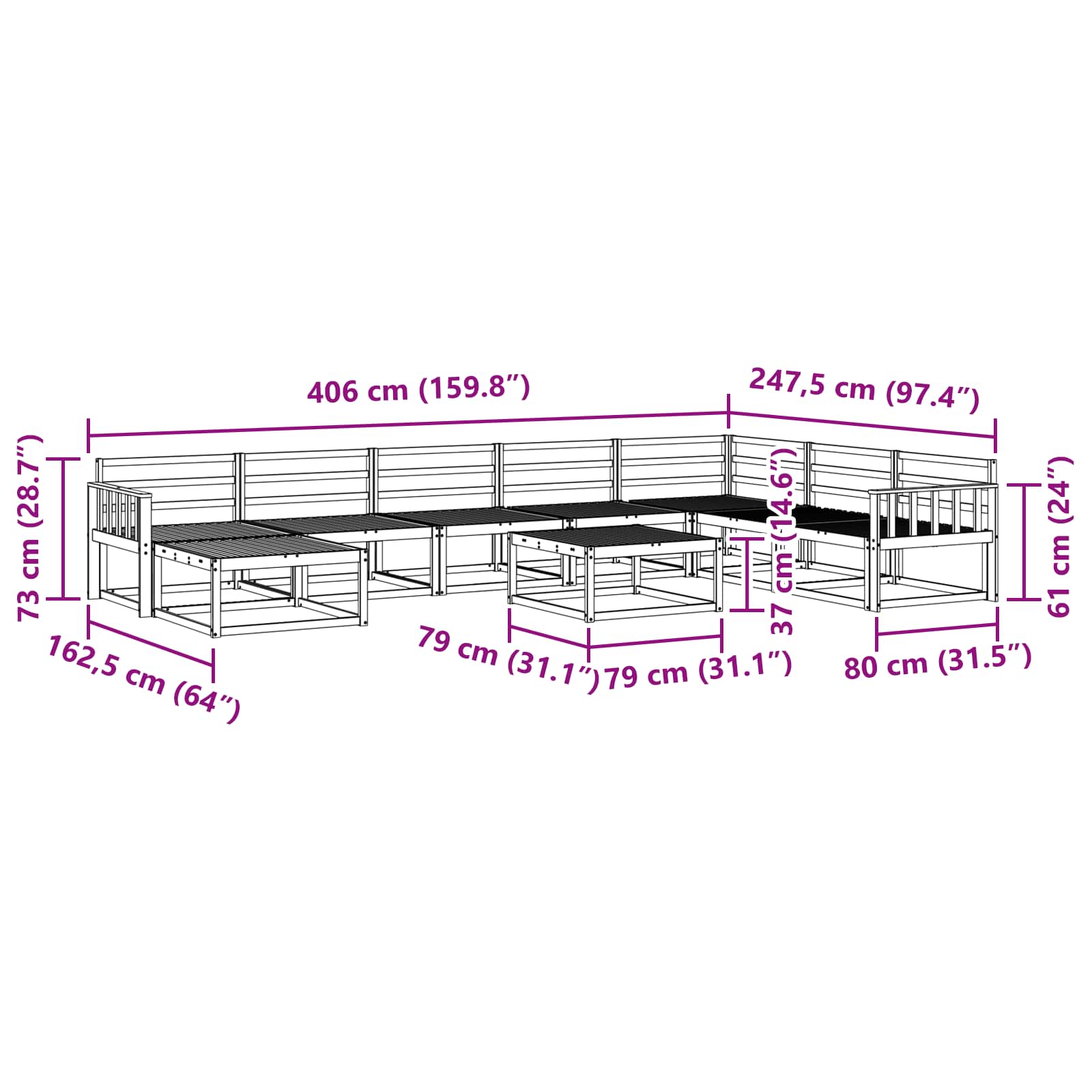 • 6 x Keskisohva: 79 x 83 x 73 cm (P x L x K)