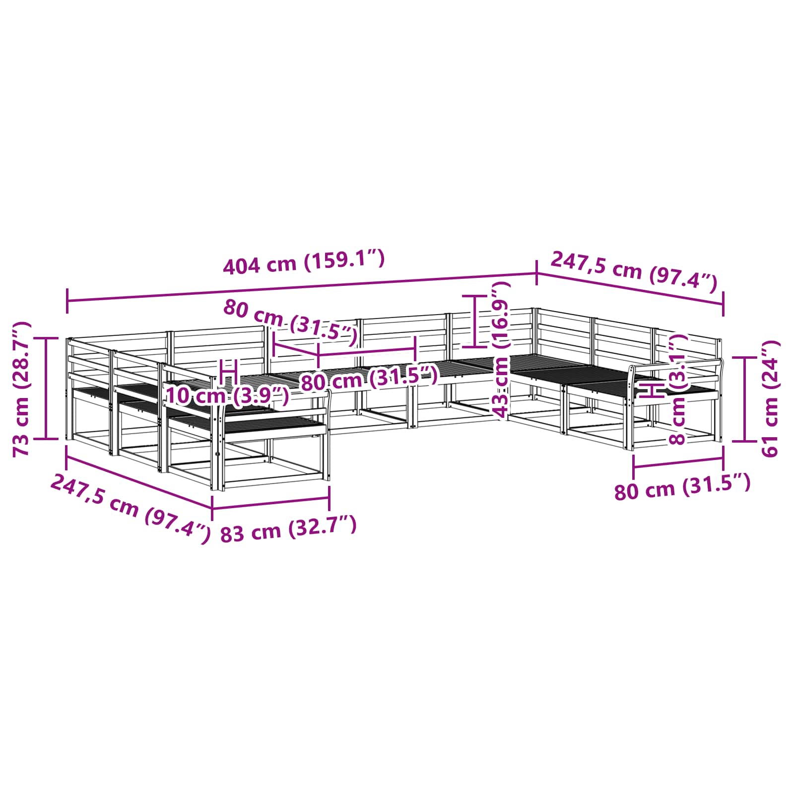• 7 x Keskisohva: 79 x 83 x 73 cm (PxLxK)