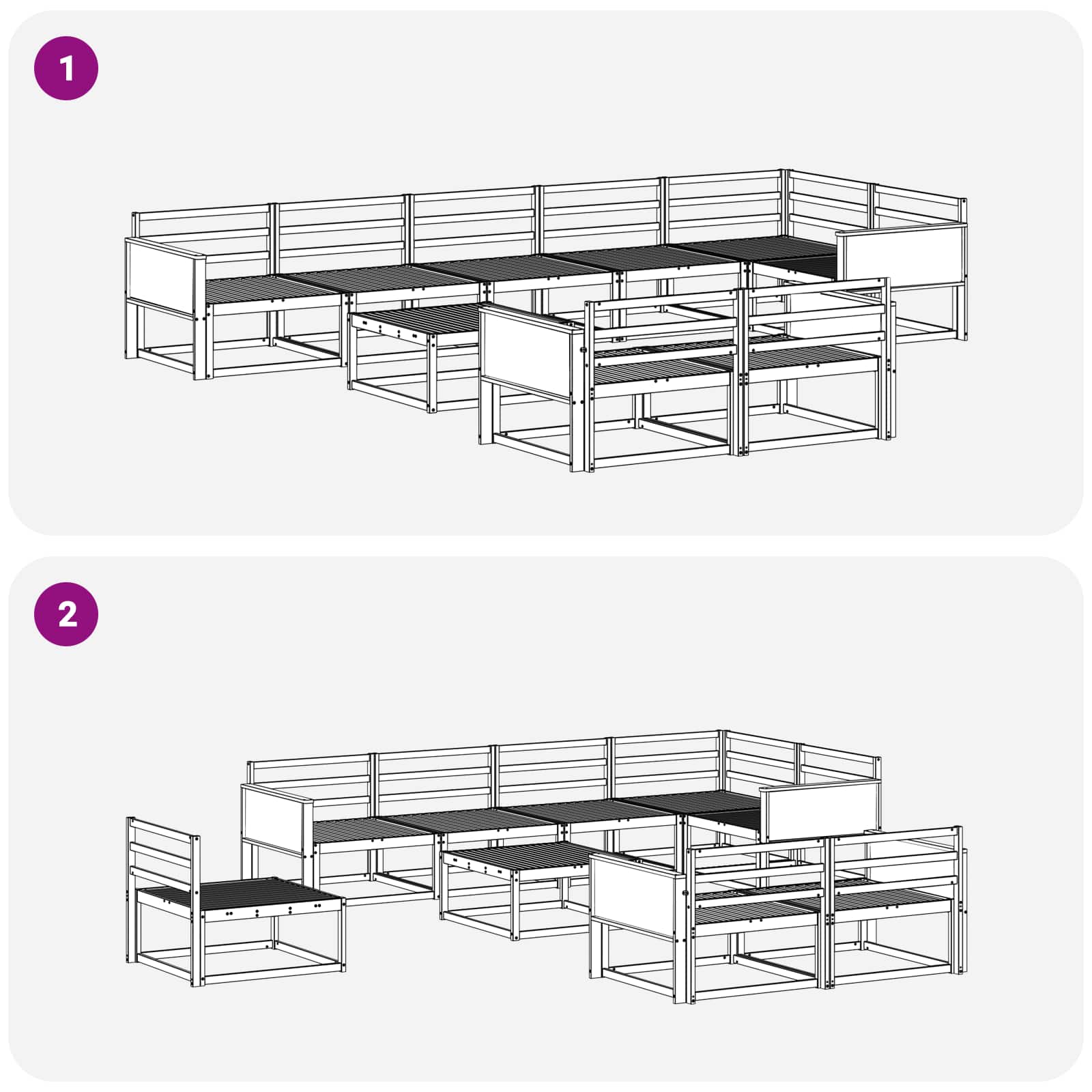 • Ominaisuudet / Toiminta / Muotoilu: Modulaarinen muotoilu tarjoaa monipuolisuuden, joka mahdollistaa eri istumajärjestelyjen mukauttamisen tiloihin, olipa kyseessä laaja terassi tai pieni puutarhan nurkka. Ritilärakenne näyttää kevyeltä, mutta tukee hyvin, pitäen samalla puhtaat viivat modernin minimalistisen tyylin mukaisesti.