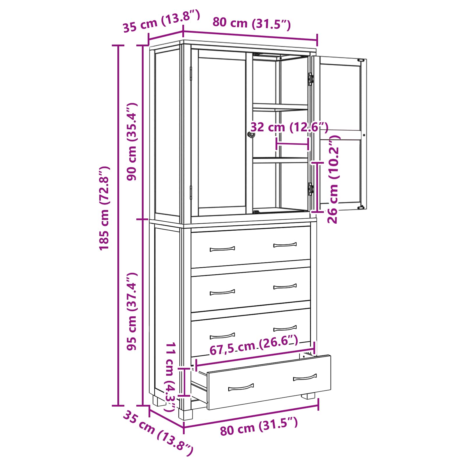 Materiaalit: Valmistettu laadukkaasta teknisestä puusta, tukeva tammi ja mänty takaavat kestävyyttä ja tyyliä. Materiaalit pystyvät kestämään käyttöä niin kesä- kuin talviaikoina, ja luonnollinen viimeistely parantaa ulkonäköä helposti. Ominaisuudet: Jokaisen osan sileä pinta ja kauniit yksityiskohdat tekevät siitä todella tyylikkään. Tukeva tammi jalat ja runko tarjoavat luotettavaa kestävyyttä ja pitävät tavarat järjestyksessä. Ominaisuudet / Toiminta / Muotoilu: Kaatumisen ehkäisy tekee tästä setistä erityisen turvallisen perheille, joissa on lapsia tai lemmikkejä. Vankka rakenne kestää päivittäistä käyttöä mallin uhraamatta. Suositellut käyttötarkoitukset: Täydellinen olohuoneisiin ja makuuhuoneisiin, tämä kokoelma tuo mukanaan järjestystä ja tyyliä. Monipuolinen muotoilu sopii erinomaisesti erilaisiin sisustustyyleihin, ottaen huomioon kaikki säilytarpeesi. Hoito & Huolto: Pidä osat parhaimmillaan yksinkertaisella huollolla. Pyyhkiminen kuivalla liinalla pitää setin aina kunnossa ja kauniina.