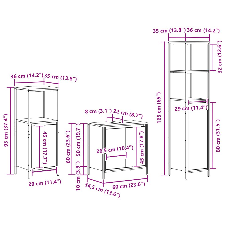 • Delivery Contains: 1 x Altaakaappi, 1 x Kylpyhuonekaappi (Korkeus: 165 cm), 1 x Kylpyhuonekaappi (Korkeus: 95 cm)