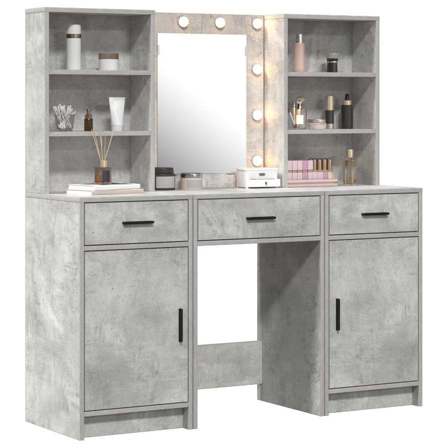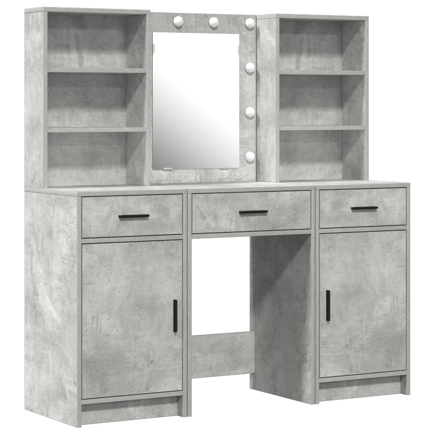 Tämä moderni meikkipöytäsetti on yhdistelmä tyyliä ja toimivuutta, tarjoten upean paikan meikkiin ja kauneudenhoitoon. Valmistettu teksturoidusta betonista ja teknisestä puusta, se näyttää tyylikkäältä ja modernilta.