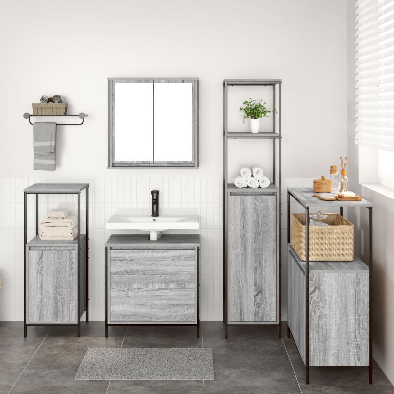 Tämä moderni kylpyhuonesäilytyssetti yhdistää toiminnallisuuden ja tyylin täydellisesti kylpyhuoneeseesi. Tyylikkään harmaan sonoma-päällysteen ansiosta tämä monipuolinen säilytysratkaisu pitää kaikki hygieniatarvikkeesi ja tekee tilastasi upean.